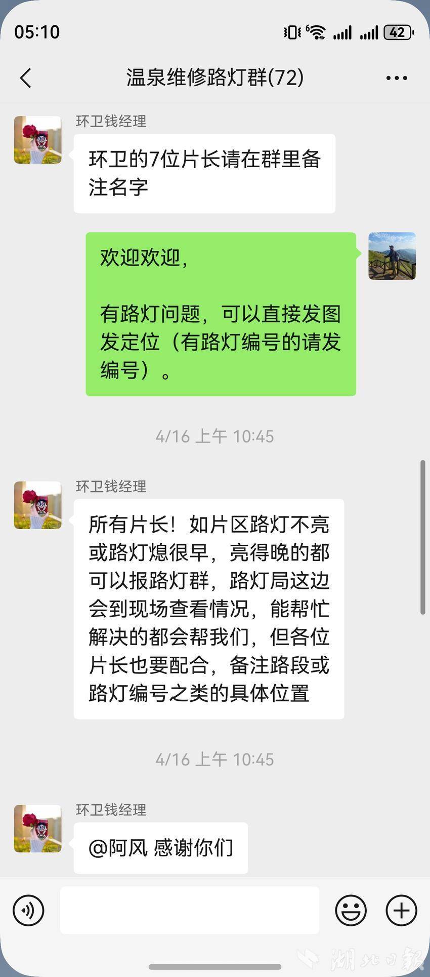 此前,针对环卫工人凌晨作业的特殊需求,咸宁市路灯管理服务中心打破常规服务模式,以服务温度检验作风转变,建立起“扫帚声里的响应机制”。15位环卫班组长被纳入“路灯服务网格微信群”,手持扫帚的劳动者与路灯维护人员实现“指尖对话”。以往需要层层上报的照明问题,如今通过实时定位、图片上传,便能即刻启动处置流程。