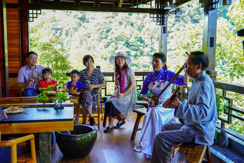 在大湾口景区内,山歌对唱赢奖品活动吸引众多游客的参与,现场气氛热烈,歌声此起彼伏。此外,传统非遗展演精彩不断,南曲婉转悠扬、打溜子激昂澎湃,非遗传承人在山水间奏响千年回响,为游客呈现了丰富的文化盛宴。