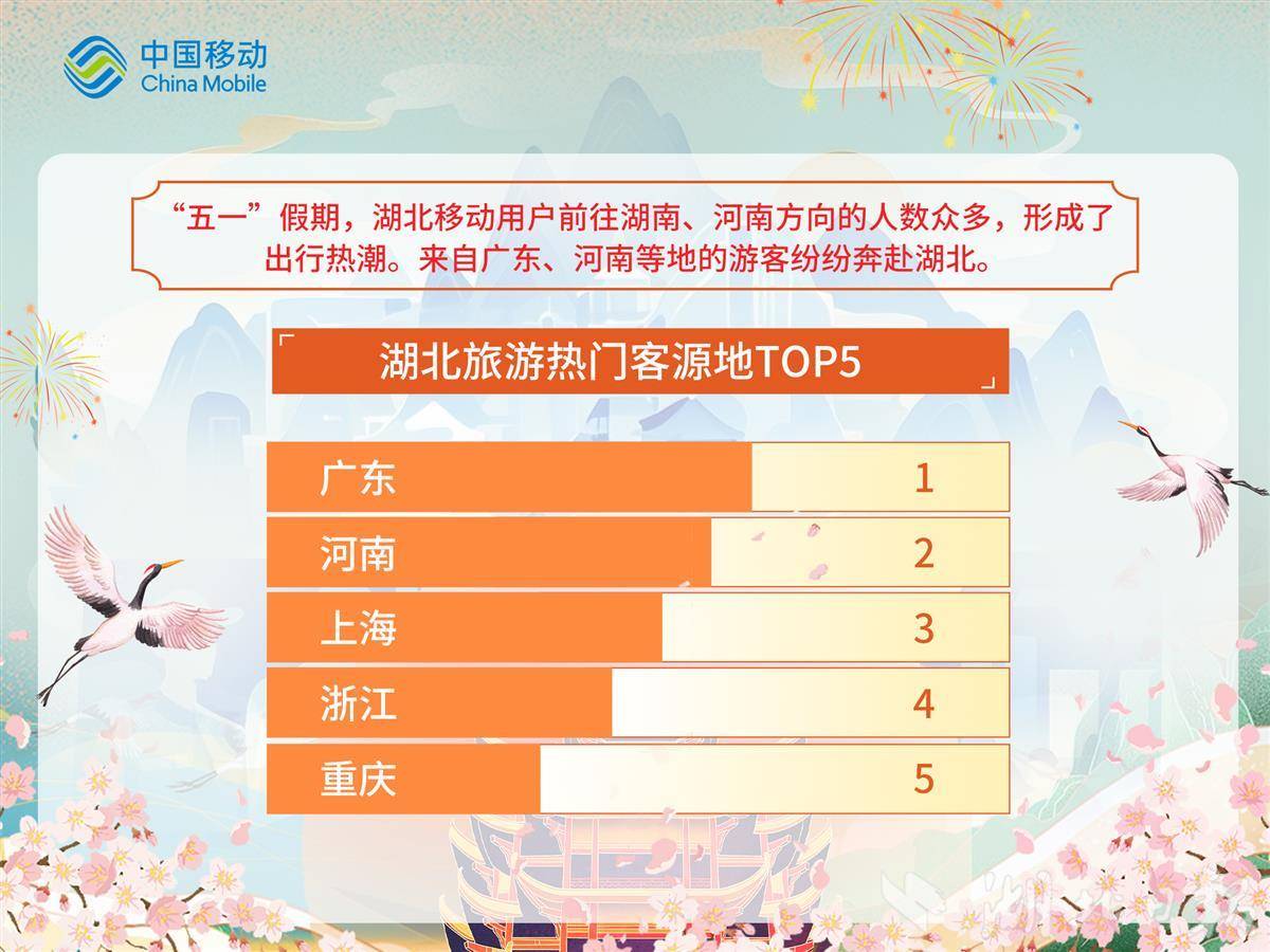 湖北日报讯(记者刘天纵、通讯员王政)5月6日,中国移动湖北公司发布《2025年“五一”大数据报告》。大数据显示:5月1日至4日,湖北共接待省外移动用户游客420.4万人次,来自广东、河南、上海、浙江、重庆的游客数量排名前五,五成以上外省游客在湖北停留天数超过2天,表明湖北已成“五一”深度旅游目的地。