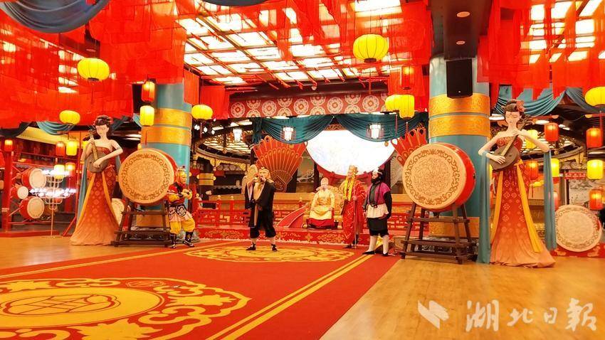 尚未回过神来,这时,耳边突然响起了电视剧《西游记》中的旋律,一群身姿婀娜的“仙女们”跳着曼妙舞蹈和身穿圆领龙袍的“唐皇”携着“西游师徒”从大殿不同方向踏歌而来,惟妙惟肖精彩的演出,在场景和灯光的交织下,让人竟分不清今夕何夕。游客们情不自禁纷纷举起手机,记录下这梦幻般的时光。