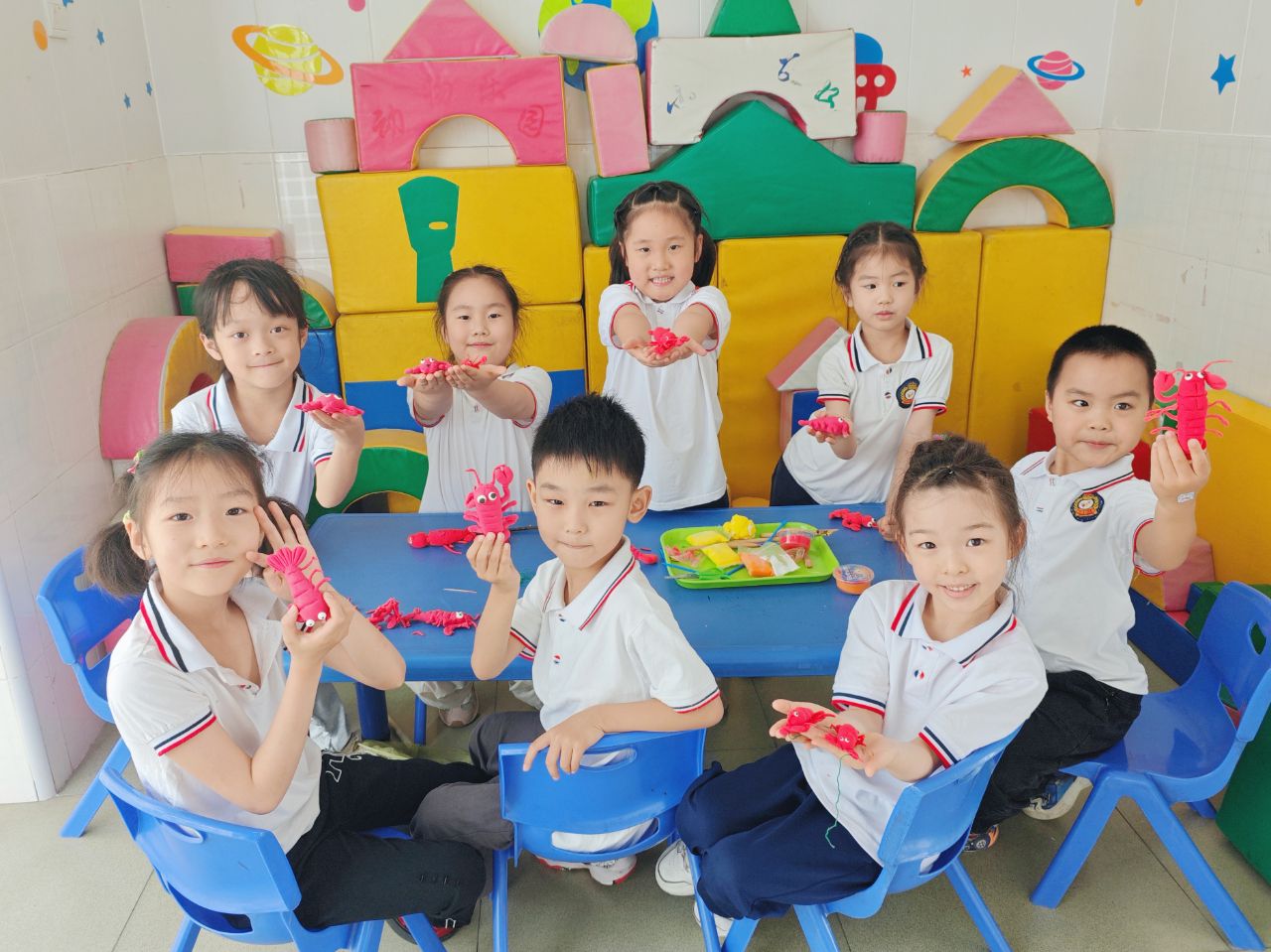 回到幼儿园,黏土创作环节中,小朋友们创意满满,超轻黏土在他们手里就像被施了魔法。不一会儿,一只只形态各异、萌翻众人的小龙虾就诞生了。有的张牙舞爪,仿佛在向大家展示自己的威风;有的安静趴伏,好像在偷偷打盹儿。
