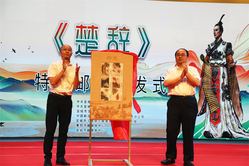 首发仪式上,武义泉与湖北省邮政分公司相关负责人共同为《楚辞》特种邮票揭幕。宜城市朗诵艺术协会带来的宋玉作品朗诵以及襄阳市花鼓戏剧团带来的歌舞情景表演《宋玉赋》等节目,让现场观众“沉浸式”感受到宋玉《楚辞》的浪漫与深沉。