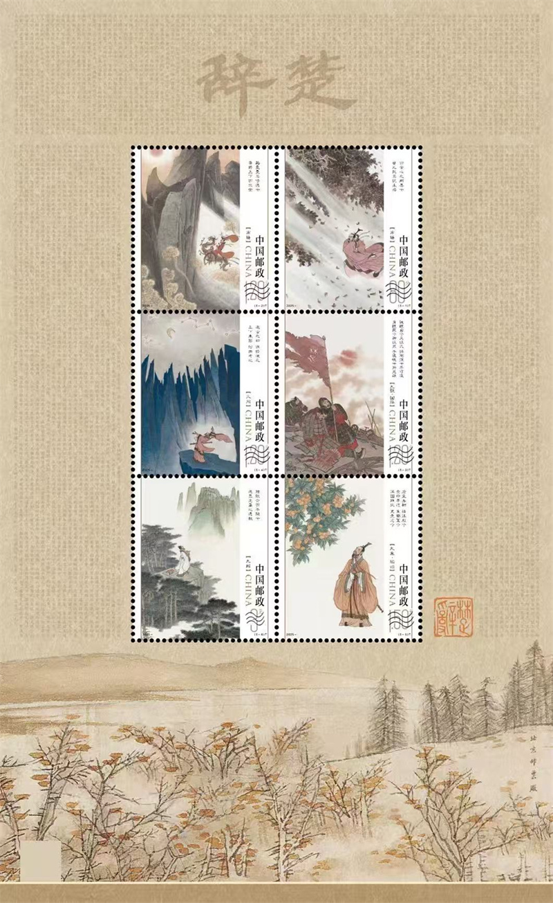 此次发行的宜城市《楚辞》特种邮票1套6枚,以“诗画相融”为设计精髓,6枚邮票分别精选《离骚》《九歌》《天问水橘颂》以及宋玉的代表作之一《九辩》中的核心诗句,融入了家国情怀、求索精神、人格美学,将楚辞的瑰丽想象与宜城山水、楚文化符号巧妙融合。邮票中的每一枚,都是楚辞精神的凝练,更是宜城历史底蕴的展现。