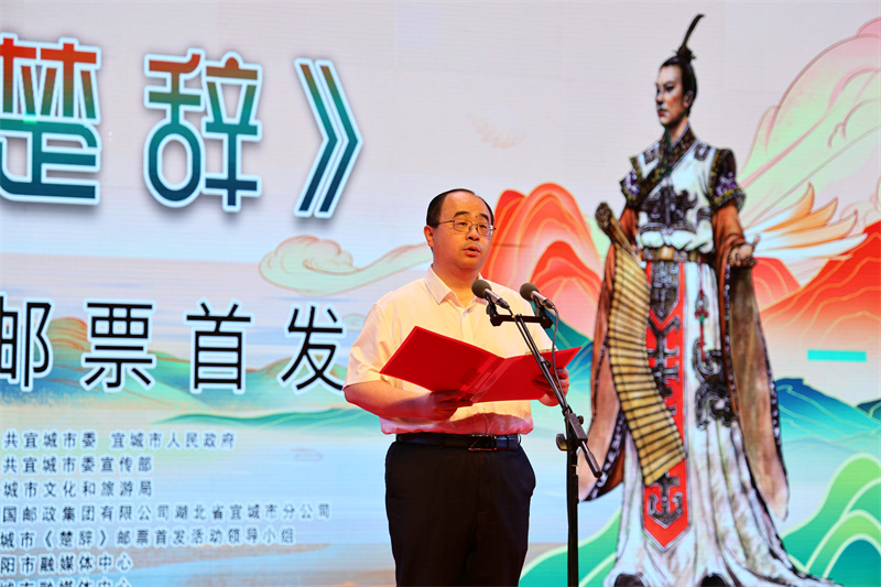 武义泉在致辞中指出,这套邮票不仅是中华优秀传统文化的璀璨缩影,更是宜城作为“楚辞故里”的文化宣言。《楚辞》是中国浪漫主义文学的源头,是荆楚大地的精神图腾。作为继屈原之后的楚辞大家宋玉,以“悲哉秋之为气也”的千古绝唱,承载着楚人开拓进取、爱国崇德的精神品格,至今仍流淌在宜城的血脉中。作为宋玉之乡,宜城赓续楚风汉韵,守护文化根脉。此次《楚辞》邮票的发行,正是以方寸之美致敬经典,让楚辞精神“活”在当下、“走”向世界。