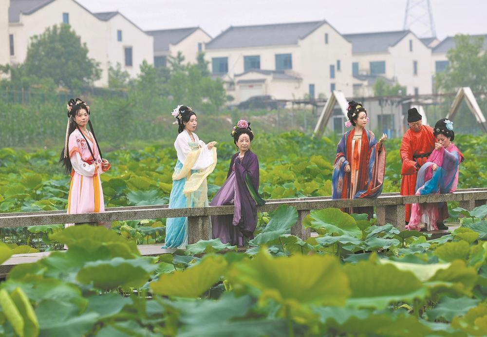 6月1日,游客身穿汉服在襄城区尹集乡姚庵村荷花湖赏花。端午假期,襄城区尹集乡姚庵村荷花湖吸引了众多游客前来游玩,体验荷花采摘、露营美食等特色项目,休闲放松,乐享假日生活。近年来,襄城区打造“露营+赏花”“露营+旅拍”“露营+音乐”等多样化消费模式,提升旅游体验的亲切感和融入感,带火乡村旅游,成为市民假日休闲娱乐的好去处。(襄阳日报)