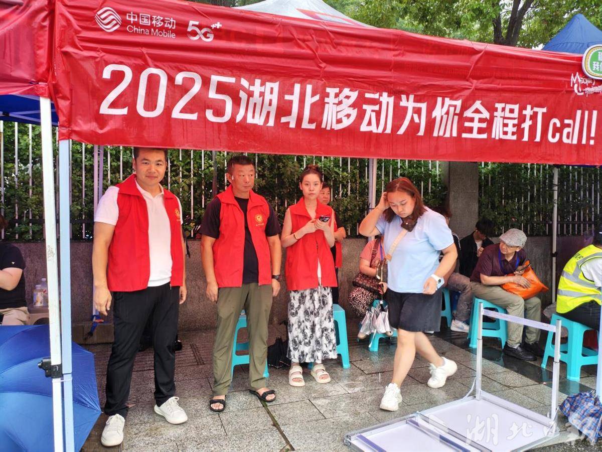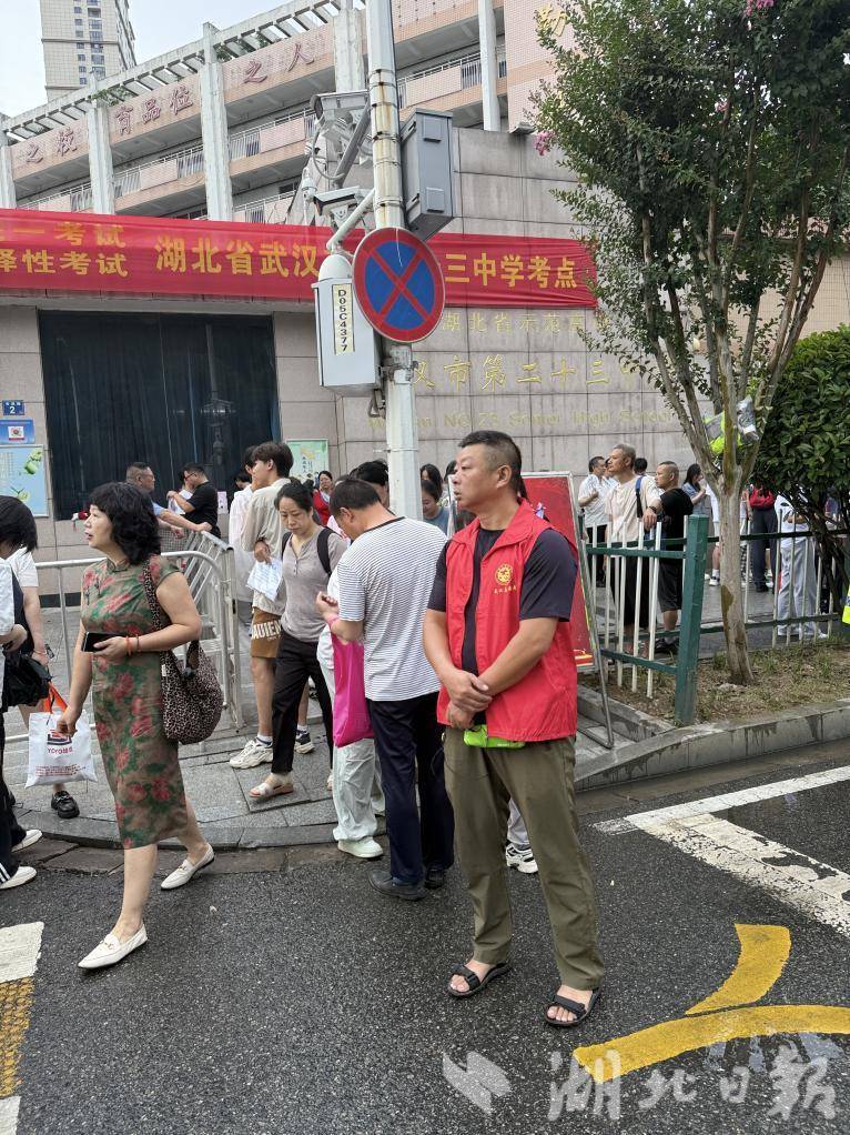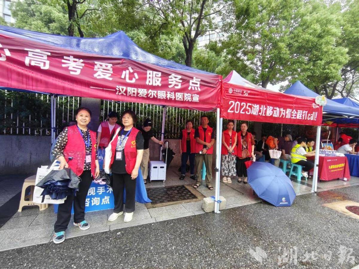 在武汉市第二十三中校门口,志愿者们身着统一服装,面带微笑,为考生和家长们提供着周到的服务。大家轮流维持秩序,为不熟悉环境的考生和家长提供指引,确保考生顺利进出考场;免费提供矿泉水,为家长们提供雨棚休息区等,给考生和家长们带来便利慰藉,有利于考生考出真实水平,为国选拔人才。