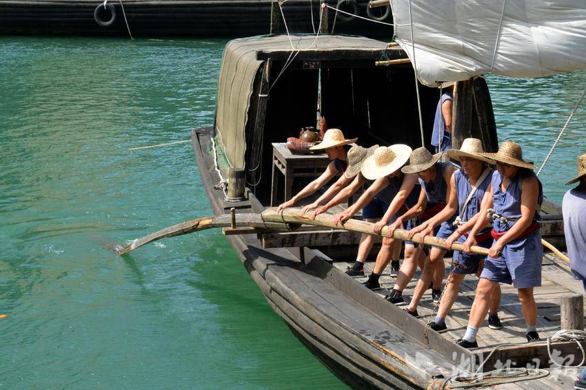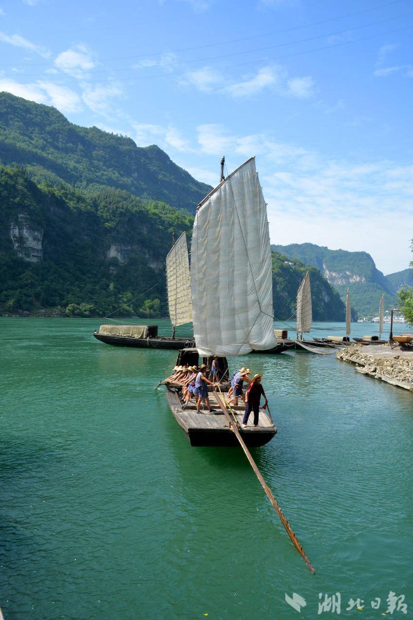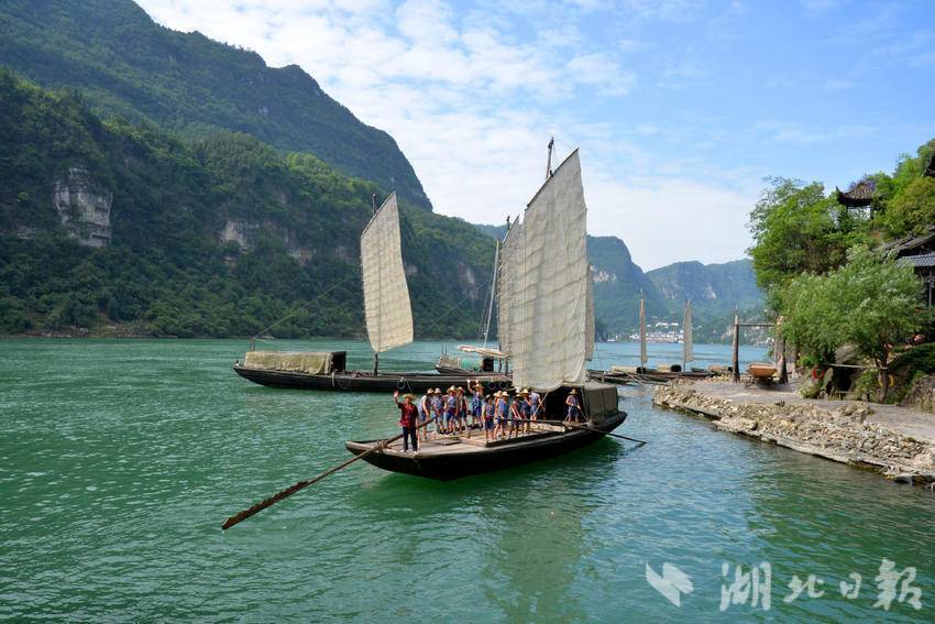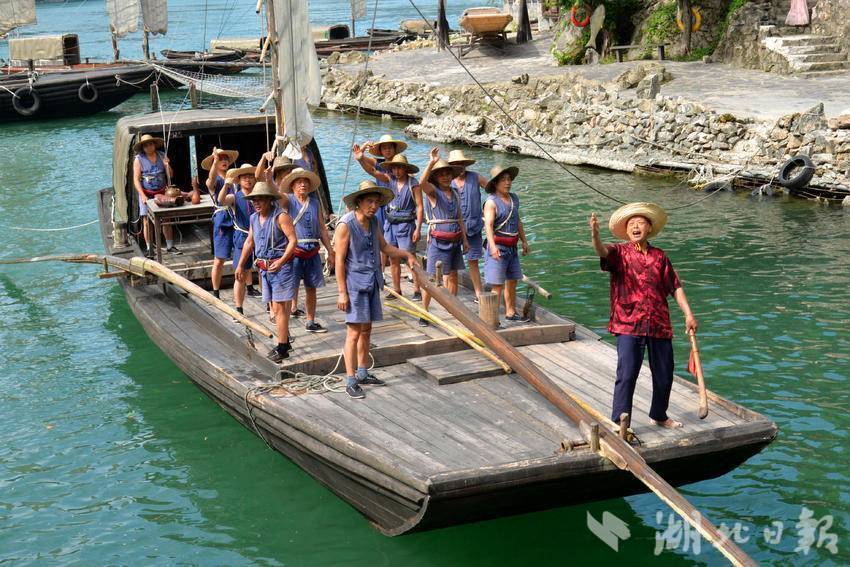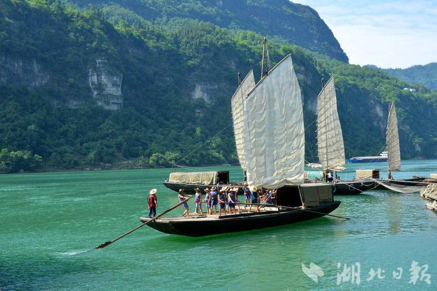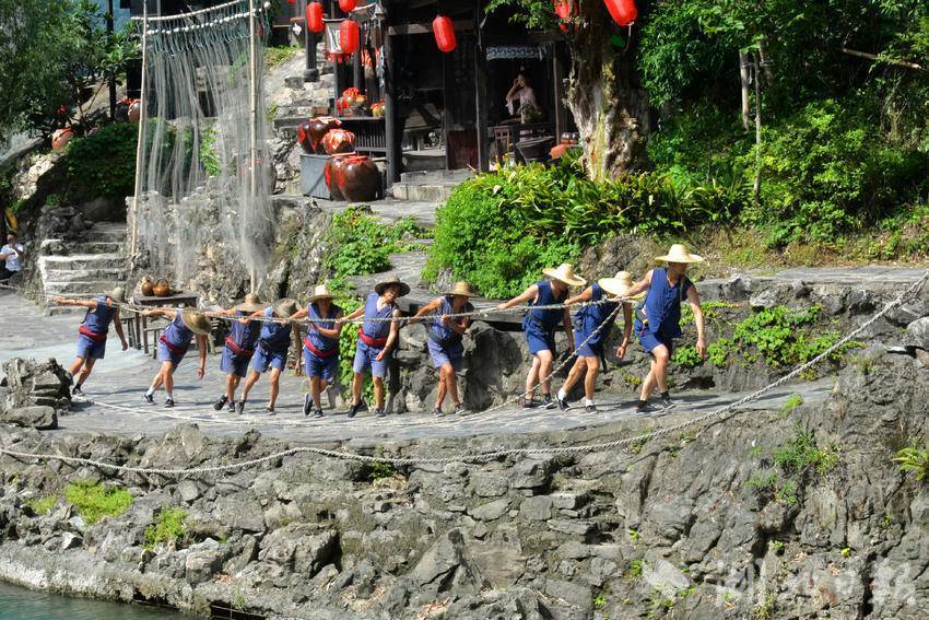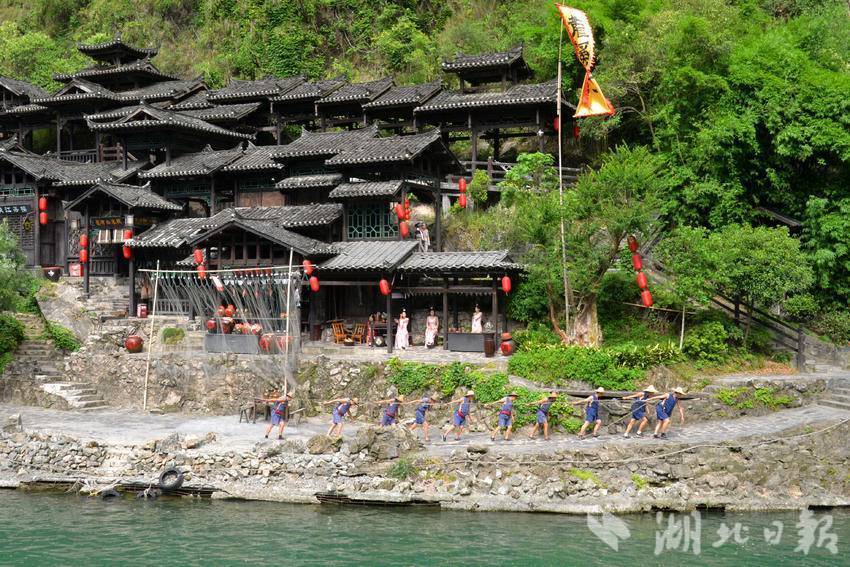 湖北日报客户端讯(通讯员张国荣)近日,宜昌市夷陵区三峡人家风景区船工演员在长江西陵峡岸边的龙津溪口为游客表演“峡江号子”,生动再现了纤夫们原汁原味、高亢雄浑、大气磅礴的拉纤、摇桨升帆等原生态场景,淋漓尽致融入在青山绿水间,迎接2025年文化和自然遗产日(6月14日)到来。