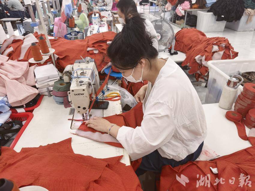 6月12日下午4时,位于天门彭市镇的悦姿服饰有限公司车间,缝纫机的“嗒嗒”声依然密集。返乡工人张明熟练地完成最后一件衣服的锁边,抬头看了看墙上的钟,脸上露出了轻松的笑容。他迅速收拾好工位,步履轻快地走出车间大门——马路正对面,就是镇上的幼儿园。