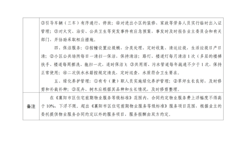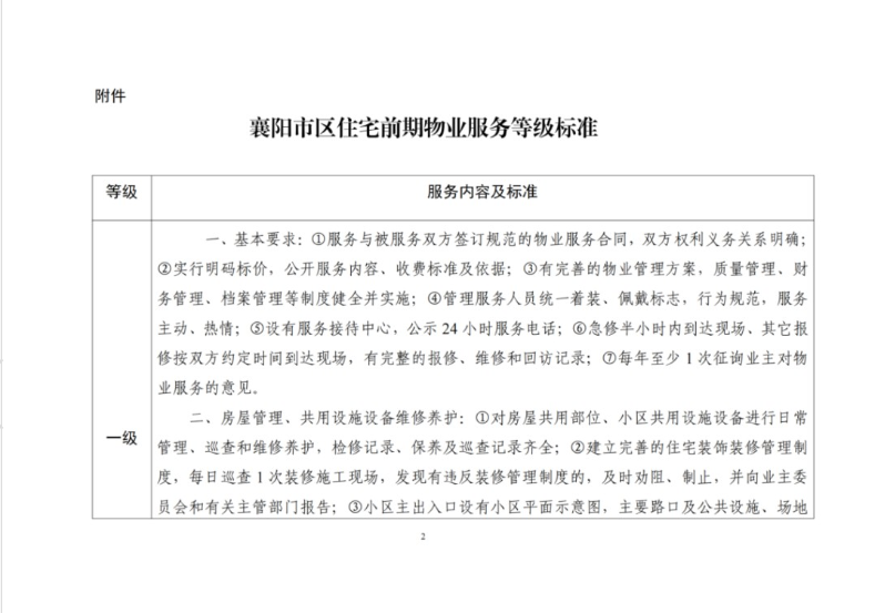 《襄阳市区住宅前期物业服务等级标准》