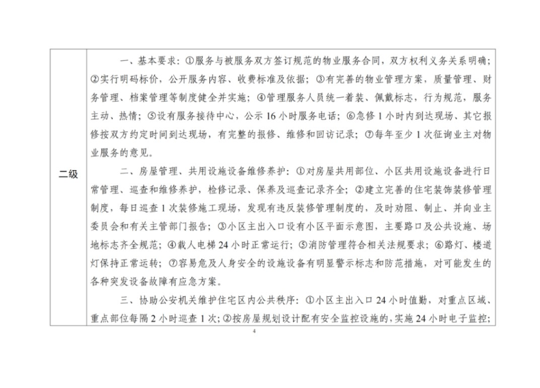 在安保方面,一级服务要求重点区域每小时巡查1次,二级服务每2小时巡查1次。多层住宅的楼梯扶手、楼道清洁频率也有区别:一级每周擦洗、拖扫两次,二级每周一次。