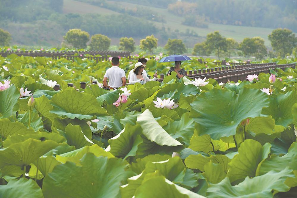 6月17日,游客在襄城区卧龙镇毕庙村荷花湖游玩。夏日,该村200余亩荷花陆续盛开,不同品种的荷花争奇斗艳,吸引游客前来观赏。近年来,卧龙镇根据各村实际,发展特色产业,实现农业与乡村旅游协调发展。