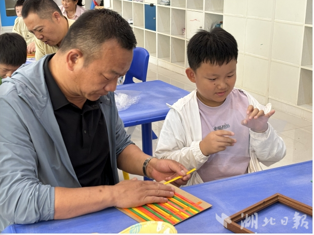 在社工与志愿者的指导下,亲子DIY 环节正式开启。湖北职业技术学院信息工程学院的志愿者们分组带领家庭,手把手教学:家长与孩子共同挑选竹篾材料,孩子负责勾勒图案轮廓,爸爸们则发挥动手优势,耐心编织竹篾纹理。“爸爸,这里要交叉编织吗?”“宝贝,你看这样斜着固定是不是更结实?”现场笑语不断,父子、父女间的互动充满温情。