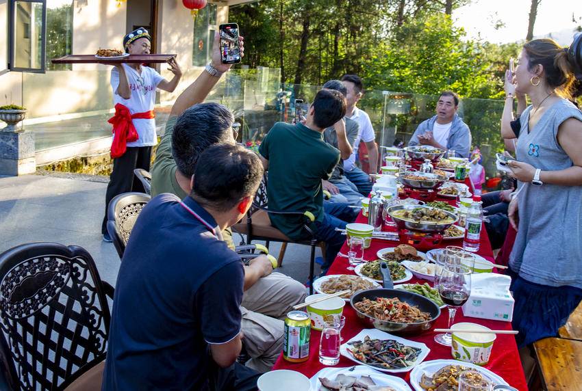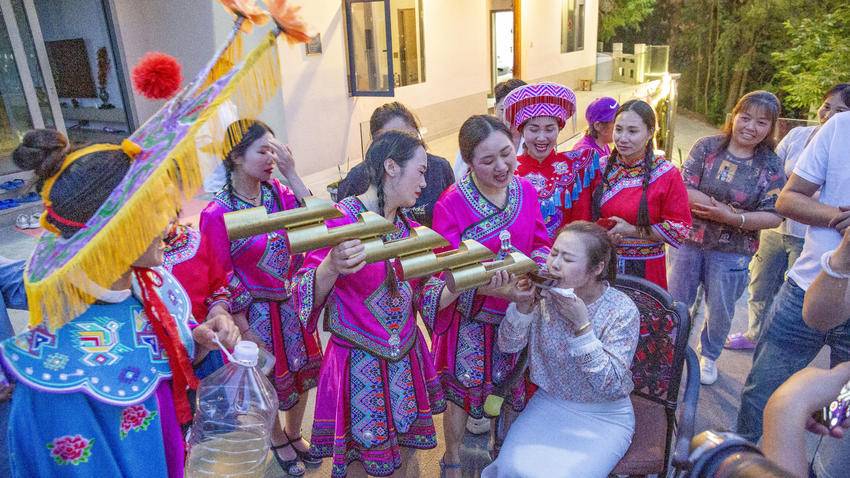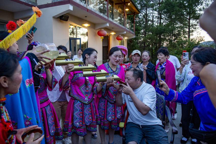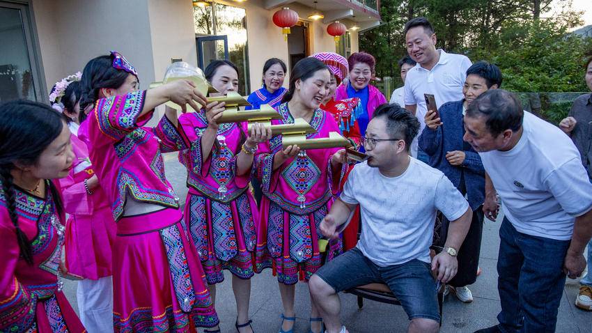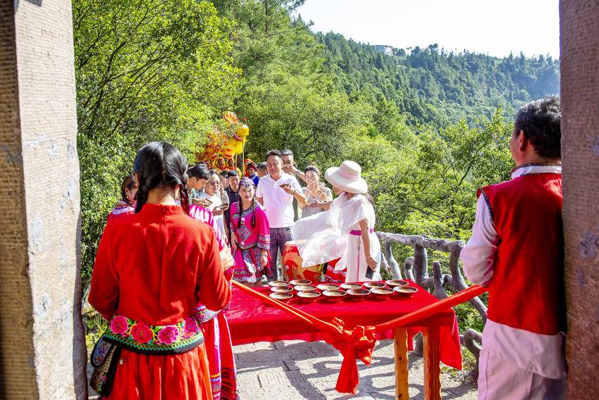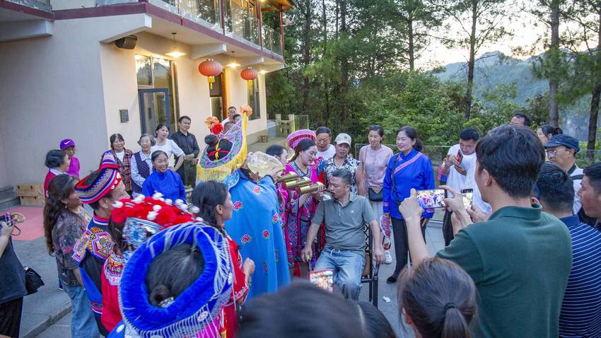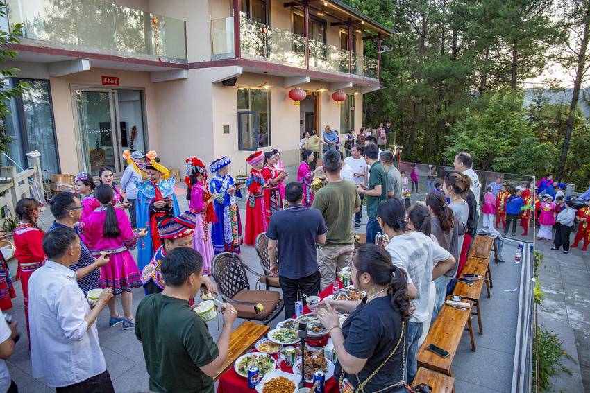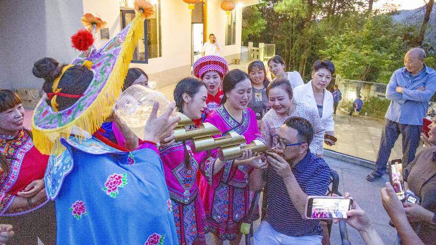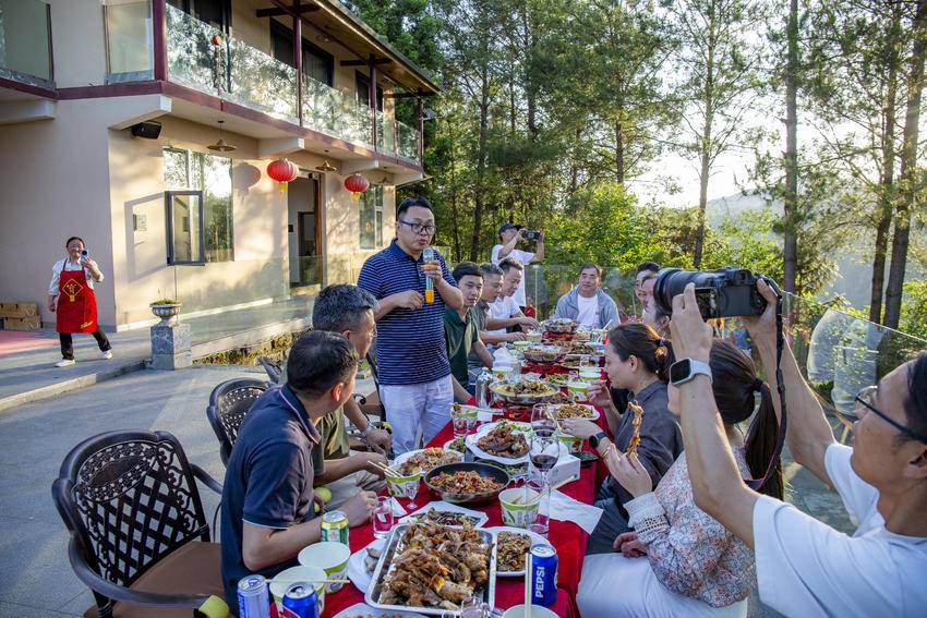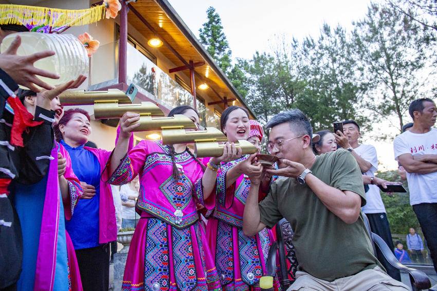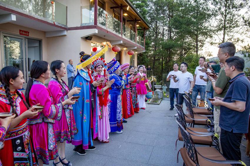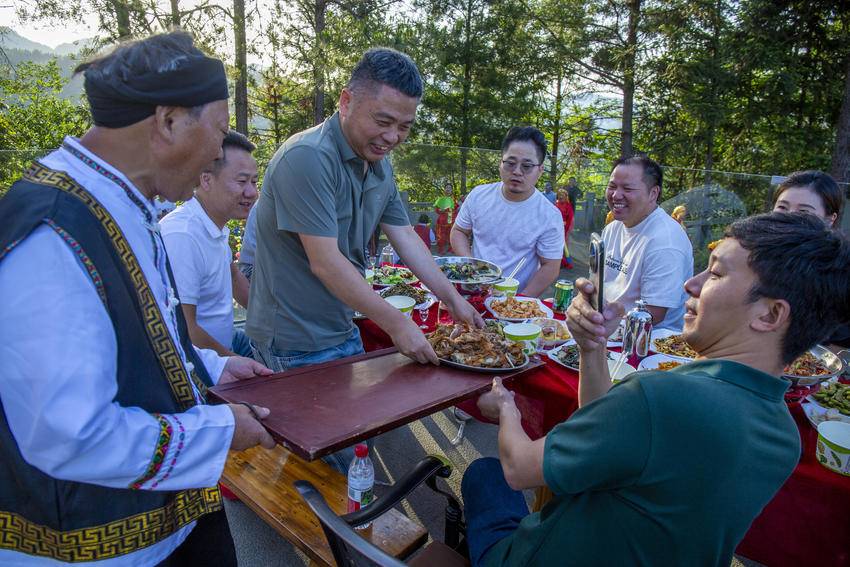 丰盛的土家宴席在热烈的氛围中开席。“土家宴席”的奇特气息混着苞谷酒的醇香,弥漫在整个院落。身着民族服饰的土家姑娘,捧着牛角杯唱起热情的敬酒歌:“远方的客人你莫走,喝碗米酒再回头……要喝你就喝,不喝我就打个眼眼灌。”企业家们笑着坐在一长串的酒筒之下,学着用土家礼节尽情豪饮。席间,土家姑娘们又唱起了土家山民歌,将土家文化和鱼木寨的传奇故事唱得荡气回肠——那是关于古人“得鱼而木动”的建寨传说,是石工世家雕刻寨楼及寨内各地石刻的匠心传承,更是一代代土家人守护家园的坚韧精神。