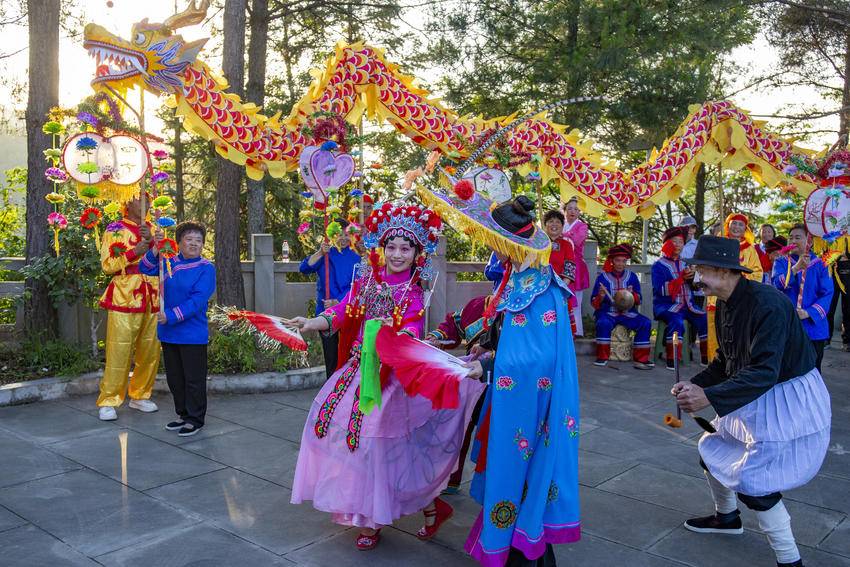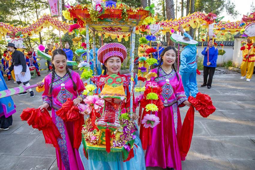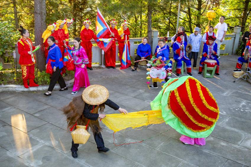 移步归耕园,竹影摇曳间,国家非遗传承人谭琴一袭靛蓝印花裙,手持彩绸折扇,清亮的土家灯歌在庭院流淌。“正月里来是新年啰喂妹娃我去拜年……”歌声婉转如山中清泉,既有土家山歌的质朴奔放,又透着灯歌特有的俏皮灵动。她身后的鱼木寨楼及树林在光影中若隐若现,与歌声里描绘的土家情景相映成趣。这种起源于农耕生活的民间艺术,曾是土家人劳作间隙的欢乐调剂,如今在谭琴的演绎下,让远道而来的客人触摸到了寨子里最鲜活的文化脉搏。