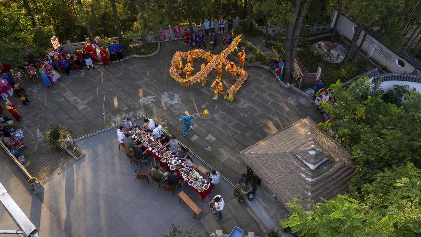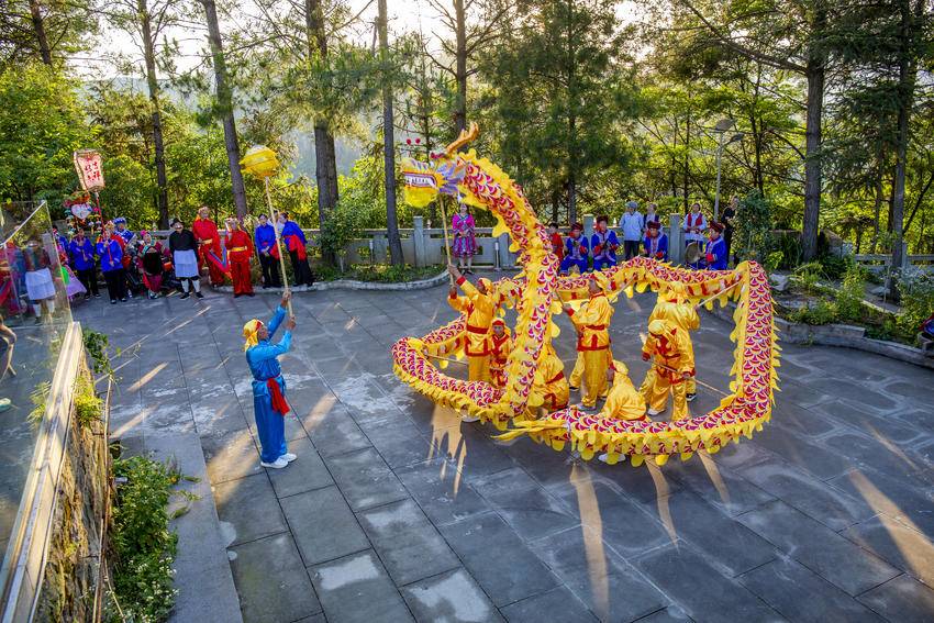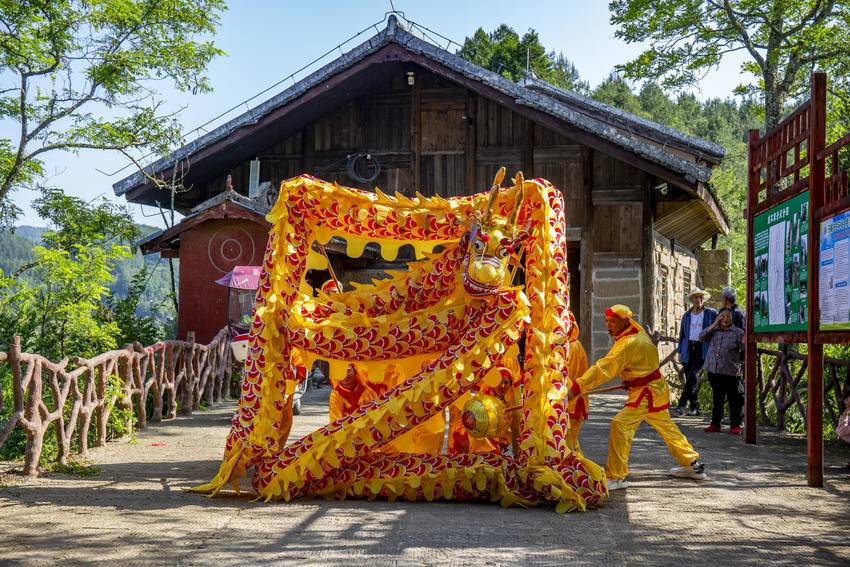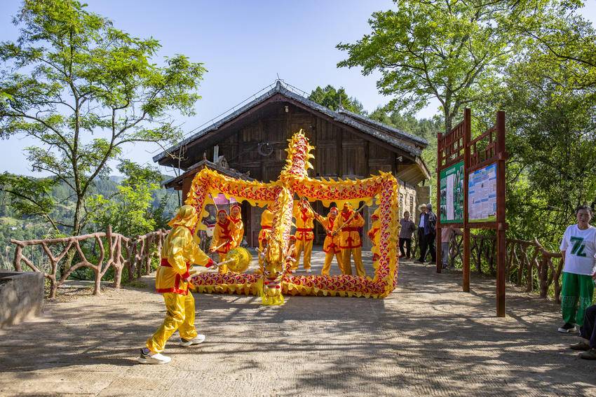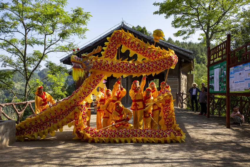 寨楼前的空地上,喧天的锣鼓声骤然响起。彩龙腾空而起,土家汉子们踏着铿锵的鼓点,在暮色中舞动出万千气象。龙头高昂,龙须飞扬,龙身如行云流水般穿梭腾跃,鳞甲在夕阳余晖里折射出细碎的金光。相传鱼木寨的舞龙已有数百年历史,每一个腾挪翻转都暗含着土家人对风调雨顺的祈愿。企业家们的目光被牢牢吸引,有人忍不住举起手机拍摄,却又怕错过任何一个精彩瞬间,索性放下设备,全情投入这场视觉狂欢。
