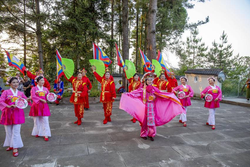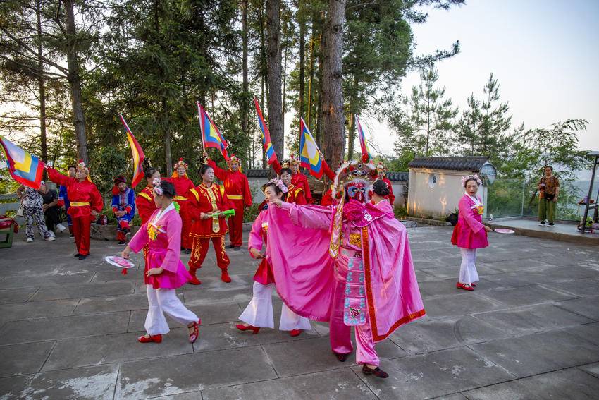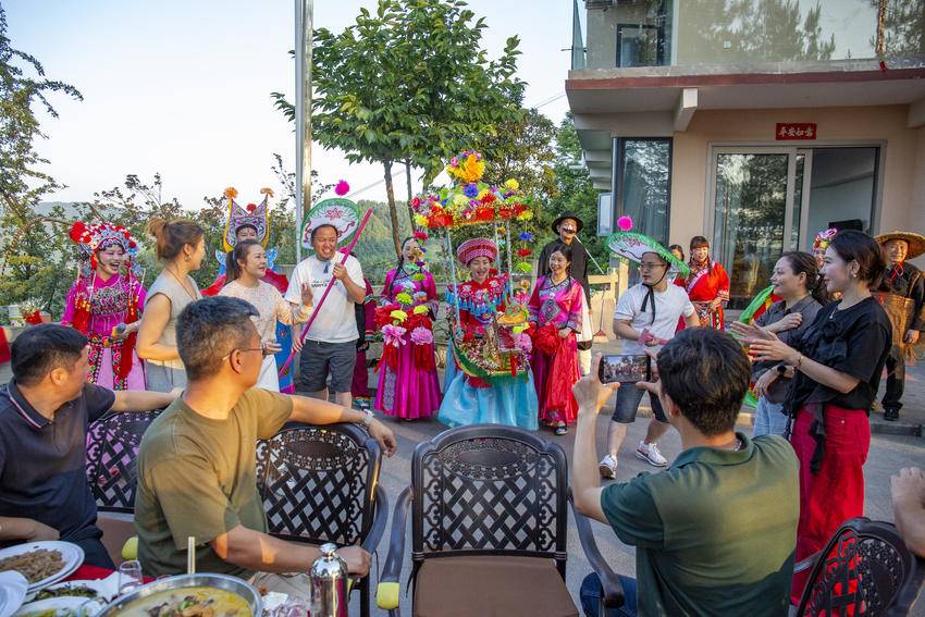 正当众人沉醉于歌声时,一阵激昂的川剧锣鼓声打破宁静。83岁的老艺术家陈茂菊身着华丽戏服,踏着台步缓缓登场。她手中折扇轻挥,眉眼间尽是戏韵。忽而一声高亢的唱腔响起,眨眼间,那张绘着精致脸谱的面庞已换成另一副色彩斑斓的面孔。变脸绝活引得满堂惊呼,企业家们纷纷起身鼓掌。鱼木寨虽地处湖北,却因毗邻川渝,百年间吸纳了川剧文化的精髓。陈茂菊的表演,恰似一座文化的桥梁,让客人们领略到这片土地多元交融的独特魅力。