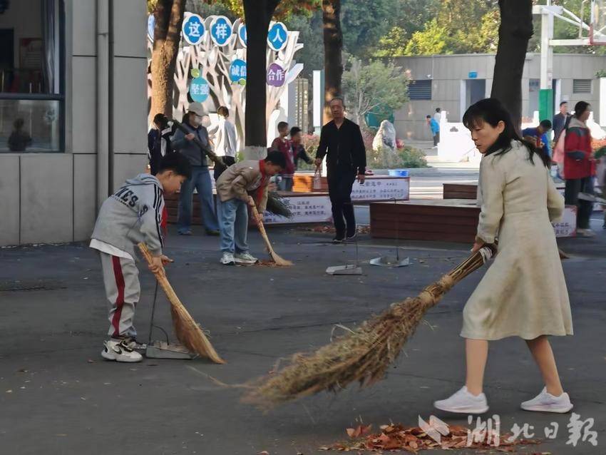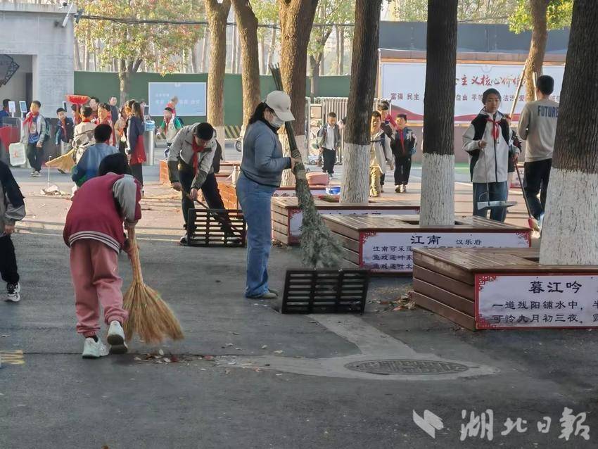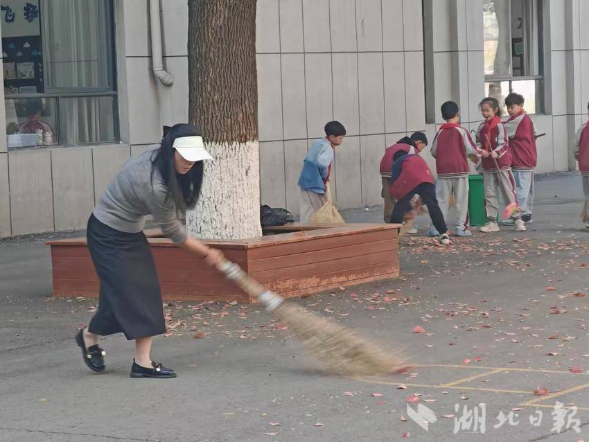 师生携手打造劳动教育”活课堂”。上午8时左右,随着孩子们陆续进入学校,一场特殊的”环境保卫战”悄然展开。负责清洁区的老师,学生们手持扫帚、簸箕奔赴”主战场”。”大家注意先清扫排水沟附近的落叶,防止堵塞!”陈老师手持扩音器指挥,话音未落,四年级(3)班的张晓萌同学已猫着腰钻进紫藤架下,用儿童扫帚仔细清理缝隙中的碎叶。身高刚过1米的低年级学生虽力气不足,却自发组成”运输小分队”,两两配合抬着几乎与肩同高的落叶袋走向垃圾站。年近五旬的李老师边挥动竹扫把边给学生示范:”扫落叶要顺着风向,像画扇形一样......”