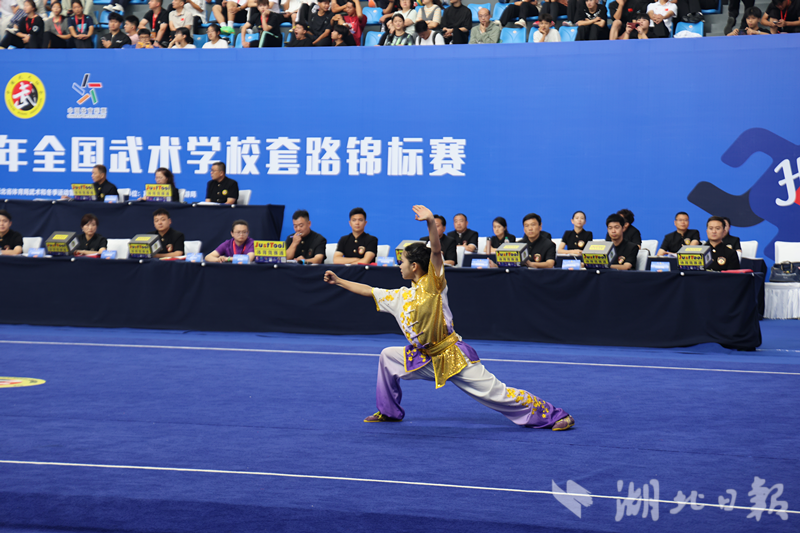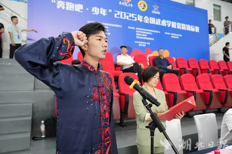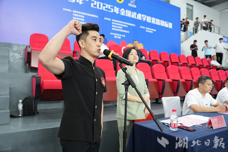 陈文胜在致辞中表示,湖北自古就有厚重的武术文化底蕴,湖北省体育局也将武术运动列为竞技体育和全民健身的重点项目。近年来,湖北省将武术发展纳入全民健身和青少年体育重点工程,推动传统武术进校园、进社区、进乡村,让武术成为弘扬中华文化、增强民族自信的重要载体。本次比赛为各位参赛选手提供了一个展示自我、交流技艺的舞台。期望通过这场全国性赛事,进一步激发青少年对武术的热爱,让更多孩子在强身健体中传承文化根脉、锤炼意志品格,成长为堪当民族复兴大任的新时代武术人。