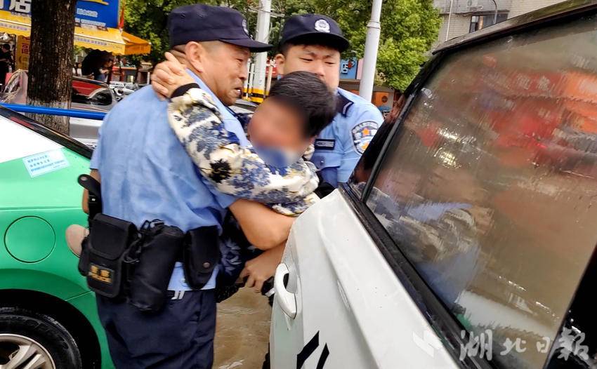 黄石港区分局沈家营派出所民警迅速赶赴现场,只见积水没过小腿。民警挽起裤脚蹚水靠近车辆,了解到老人术后身体虚弱,不便涉水,先将其女儿背至警车上等待,再返回来小心翼翼地将老人稳稳抱起,另一名民警则在一旁全力搀扶、护住老人,并为她撑伞挡雨,将老人安全转移到警车内。