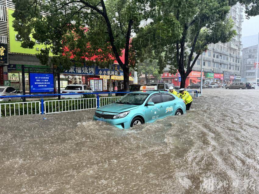 同一时刻,黄石港区湖滨大道芜湖路口,一辆出租车在路口积水区突然熄火,堵塞了本已车流量大的道路。执勤交警迅速上前,合力将出租车推出积水区。