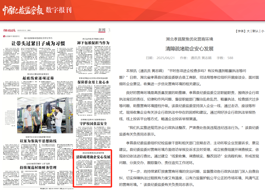 6月21日,《中国纪检监察报》以《湖北孝昌聚焦优化营商环境 清障疏堵助企安心发展》为题,报道了孝昌县纪委监委监督推动营商环境提档升级的做法。