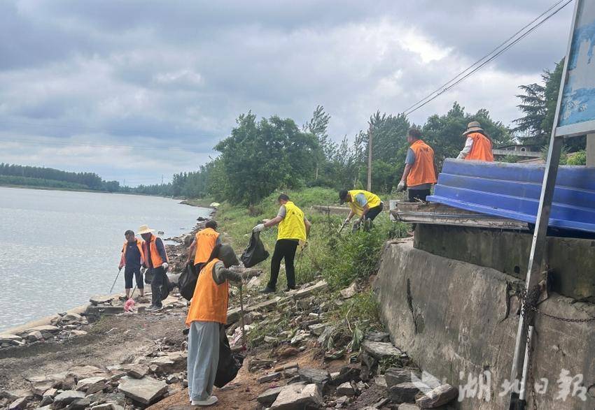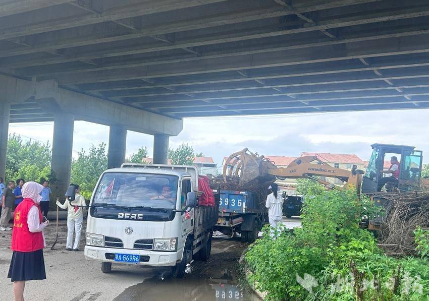 问津大桥下,百余名工作人员挥动铁锹清理碎石积泥,大型工程车辆配合清运杂物;李集大桥下,20余名执法队员与保洁员分头行动,对河岸垃圾及桥面尘土污渍进行清理;新洲老大桥处,拉横幅、挂标语,各小组分工明确,清垃圾、除杂物。