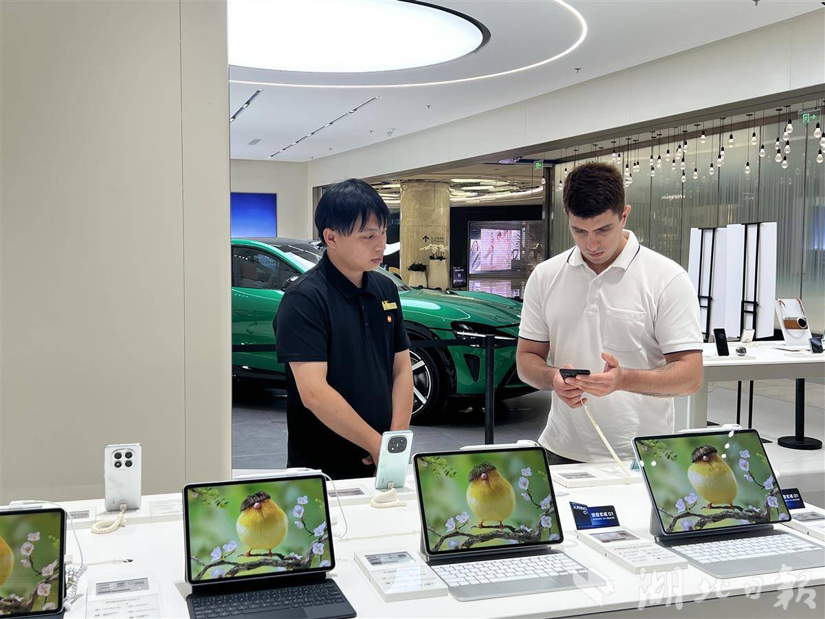 来自英国的外籍教师Alex,来武汉探望女友并旅游期间,在武商梦时代小米之家预约了品牌新款新能源车YU7试驾体验,试驾结束后对小米的手机和智能手表也产生浓厚兴趣,当场选购了总价为1968元的小米Note 14 Pro 、小米手环10。作为全省首批境外旅客离境退税试点商场,武商梦时代为Alex提供了便捷的退税服务。