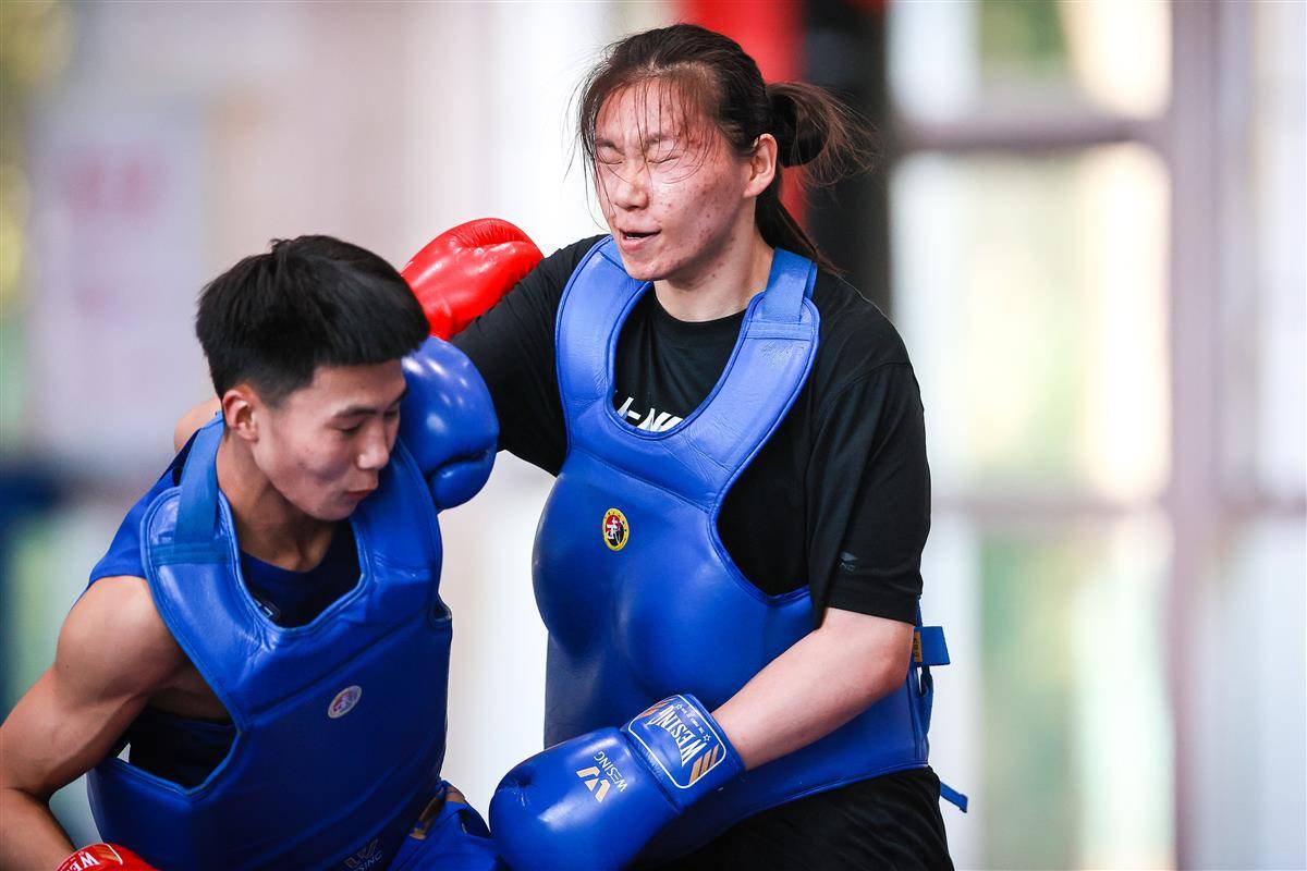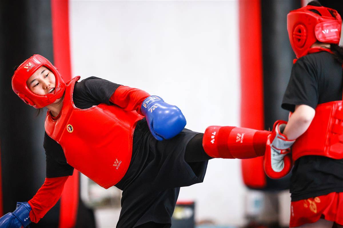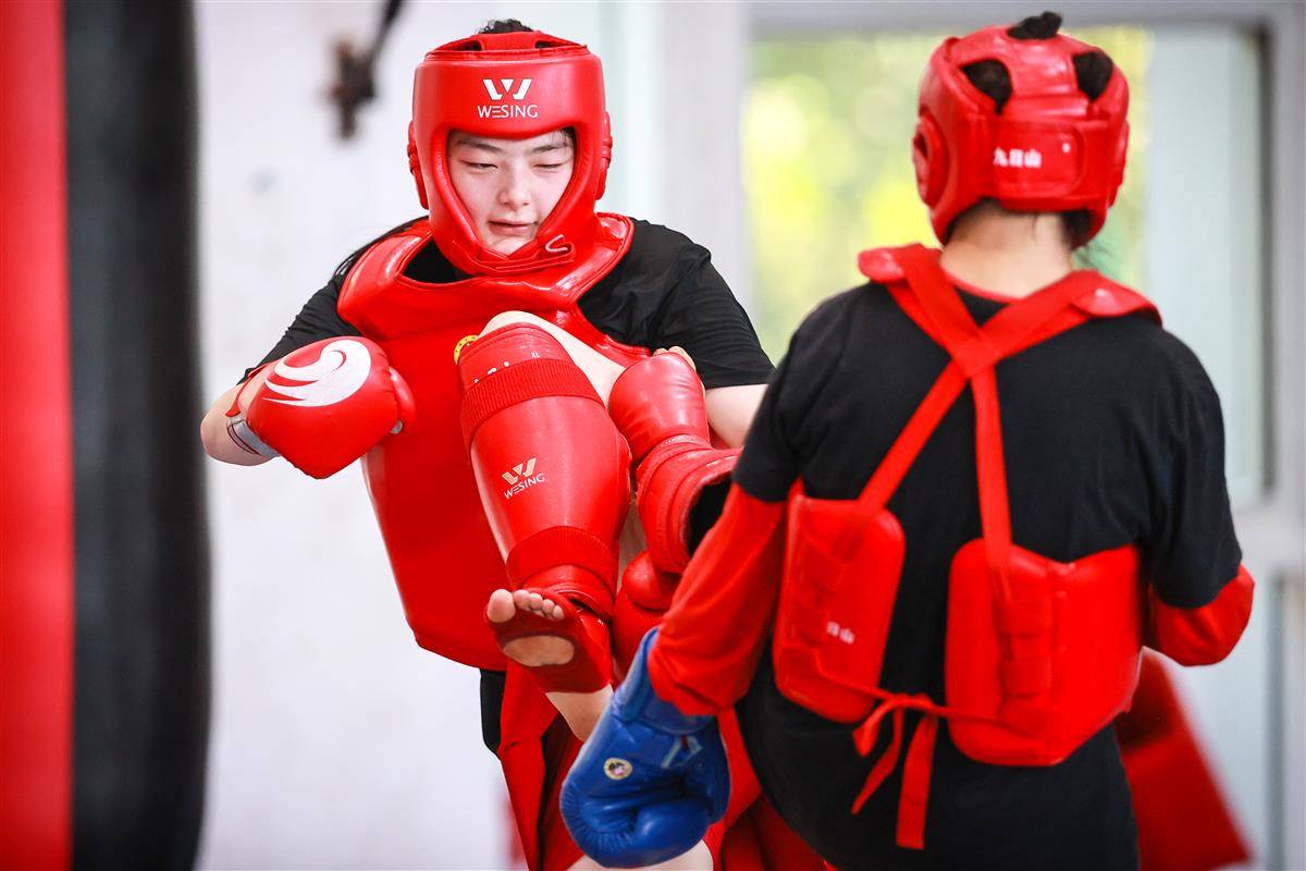 7月2日,湖北省奥体中心武术馆,湖北女子散打队、湖北武术队正在有序进行夏训。(湖北日报全媒记者 时龚 摄)