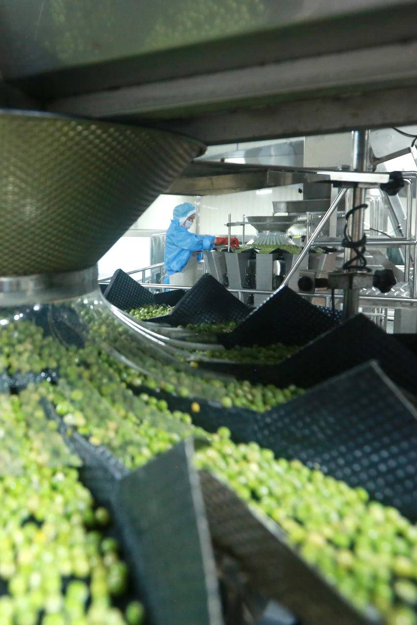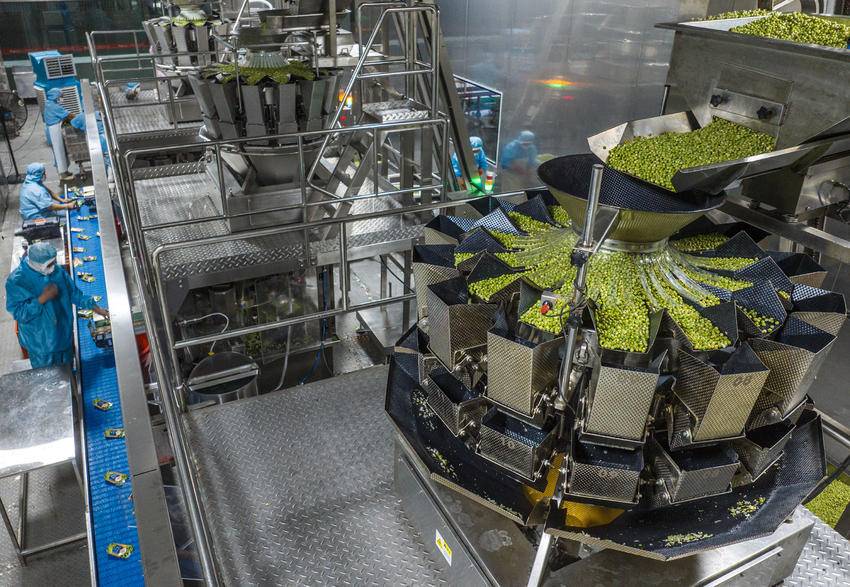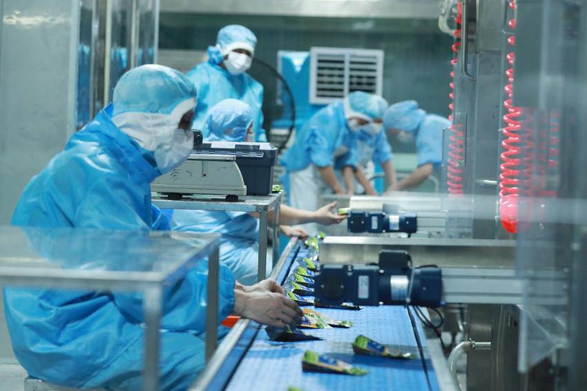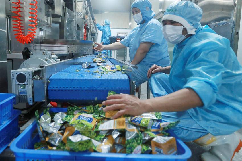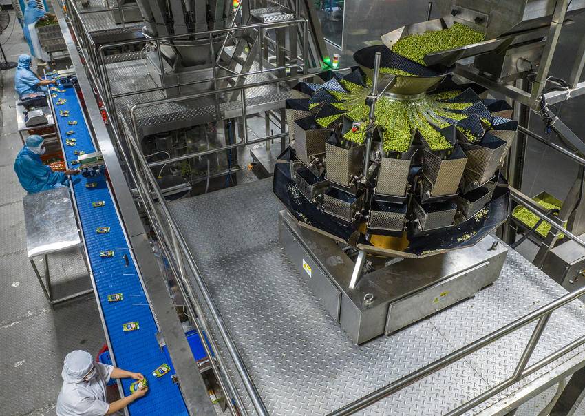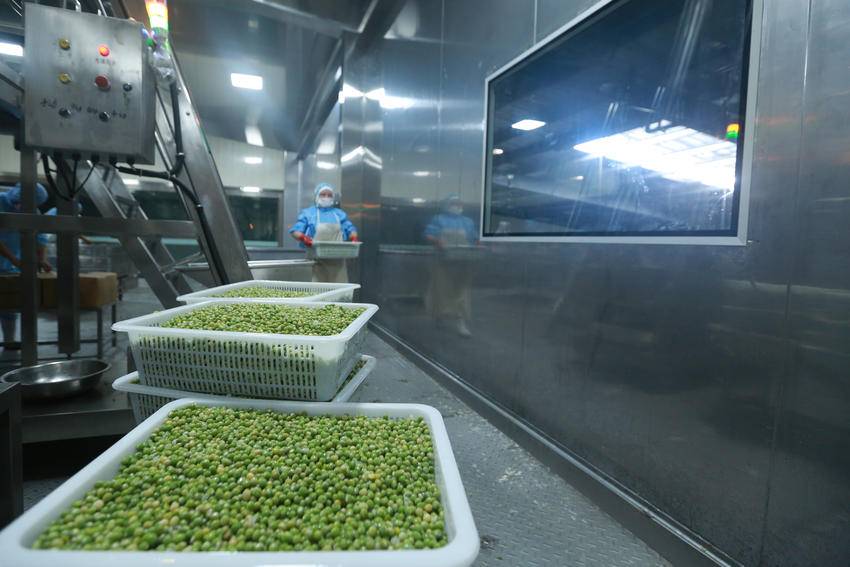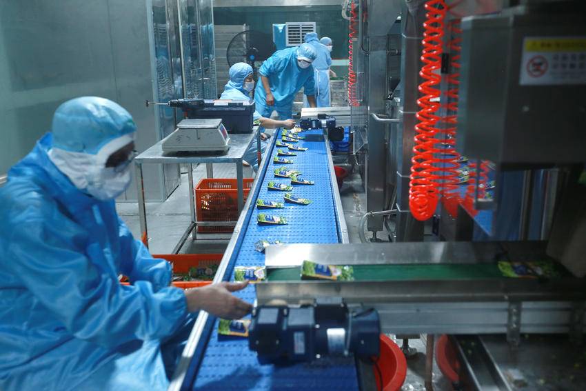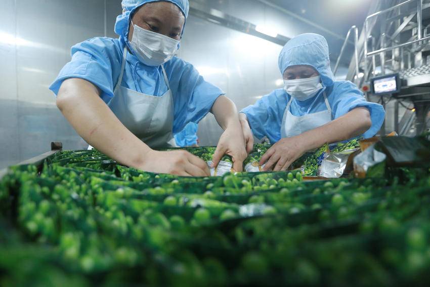 7月3日,湖北屈姑国际农业集团工人在秭归县青豆软包装自动化生产线上忙碌。