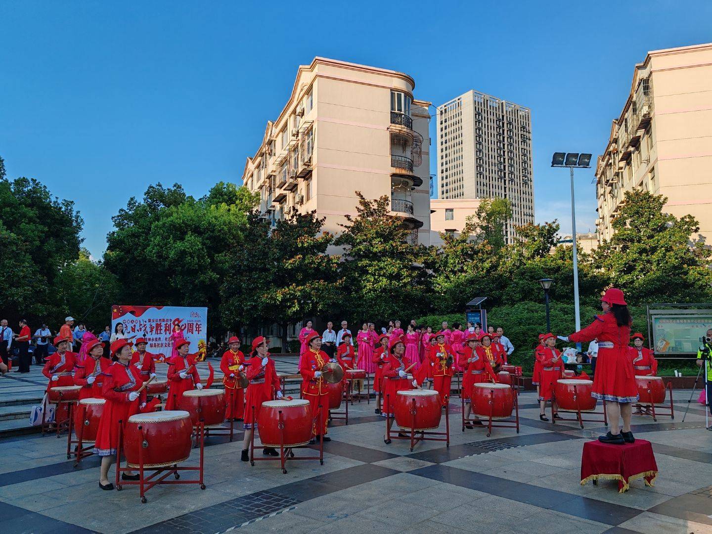 活动在喧天的锣鼓声中拉开序幕。社区社会组织东方花园威风锣鼓队的鼓点儿饱满而欢快;火红的队服如同燃烧的信念般鲜艳热烈;队伍中几位老者眼神矍铄,每一次奋力挥臂,每一次精准的落槌,都仿佛在传承烽火记忆。