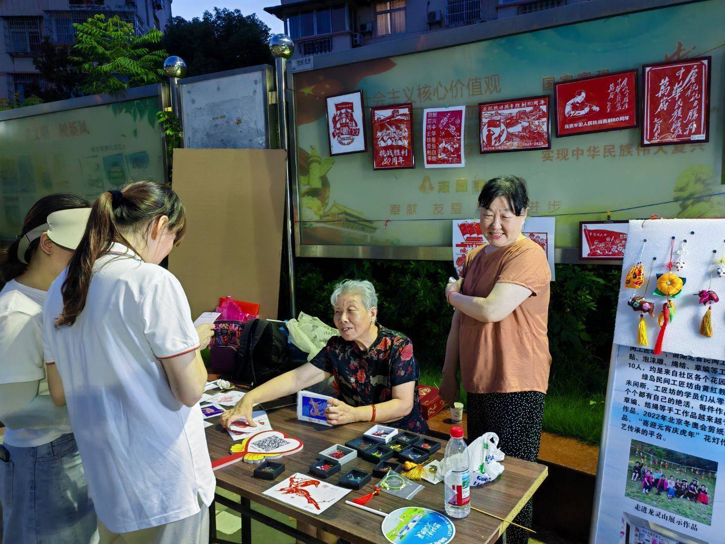 舞台一侧,民间工匠坊学员以世界反法西斯战争胜利80周年为背景,精心制作出形式多样的剪纸作品跃然纸上,引得居民驻足欣赏;手工编织的生活艺术品受到居民的欢迎,青少年沉浸式体验拓印技艺,居民们手捧拥军与禁毒手册学习,众多爱心人士纷纷解囊为社区慈善事业作贡献。