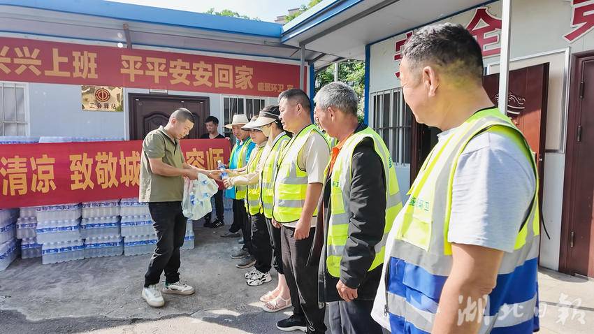 湖北日报客户端讯(通讯员储璐瑶 孙诗炜)炎炎夏日,热浪席卷全城。当市民纷纷躲进阴凉处避暑时,崇阳县盛景环卫的工人们却依旧坚守在街头巷尾,顶着烈日清扫路面、清运垃圾,用汗水守护着城市的洁净。7月7日,崇阳县宝维泰商行开展“夏日送清凉”活动,为这群可敬的劳动者送去饮用水,让爱心在高温中传递,用实际行动为炎炎夏日“降温”。