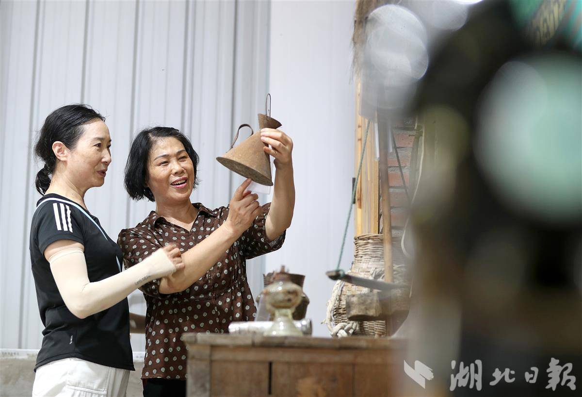 7月6日,在荆门市东宝区栗溪镇花屋场村时光客栈里,城乡游客在怀旧体验区寻好物。