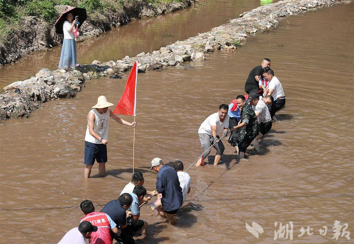 7月6日,在荆门市东宝区栗溪镇花屋场村,众多城乡游客在安全嬉水区拔河,尽享乡村消暑之乐。