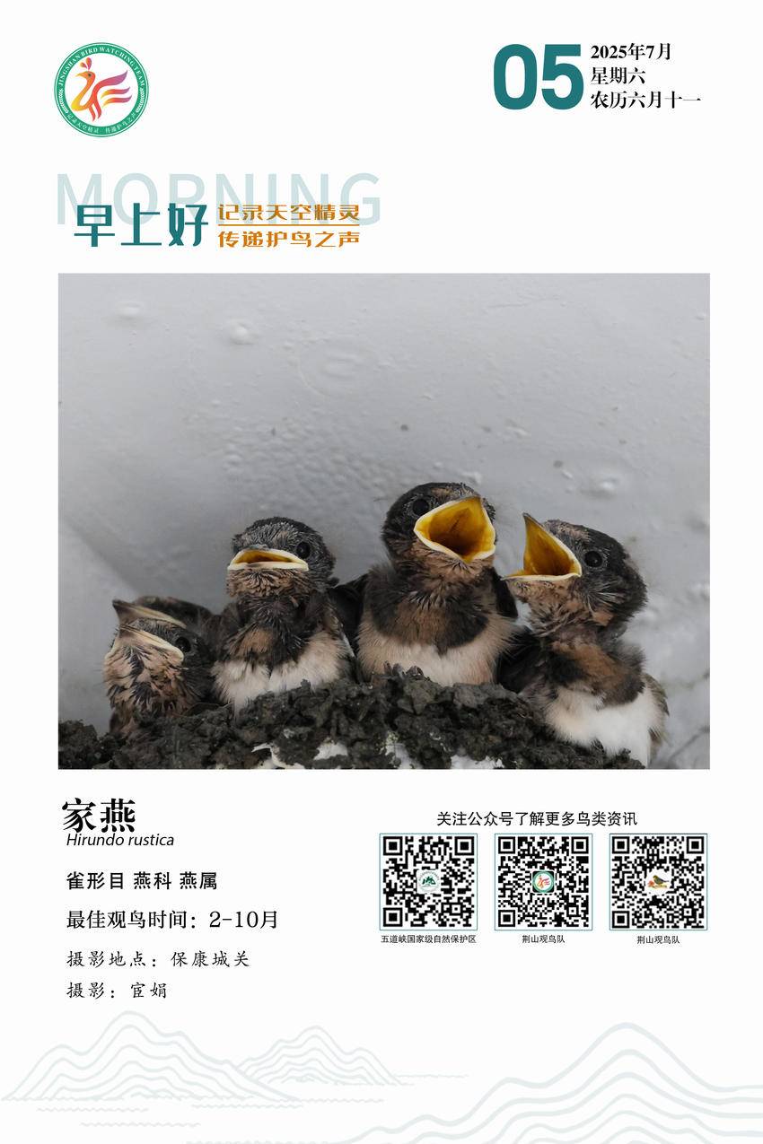 家燕(英文名:Barn Swallow,学名:Hirundo rustica),是雀形目燕科燕属的鸟类。俗名: 观音燕、燕子、拙燕,全球分布最广泛、数量最多的燕科鸟类之一,拥有最大的自然分布范围,遍及六大洲,甚至南极洲亦有记录。其特征为蓝背、深叉尾,上体钢蓝色,下体从橙红到淡黄色,胸带明显。在北半球繁殖,南半球越冬,与人类关系密切,常在人造结构如谷仓、桥梁下筑巢,利用人类建筑的优势扩大其生存范围。(来源:湖北五道峡国家级自然保护区管理局)