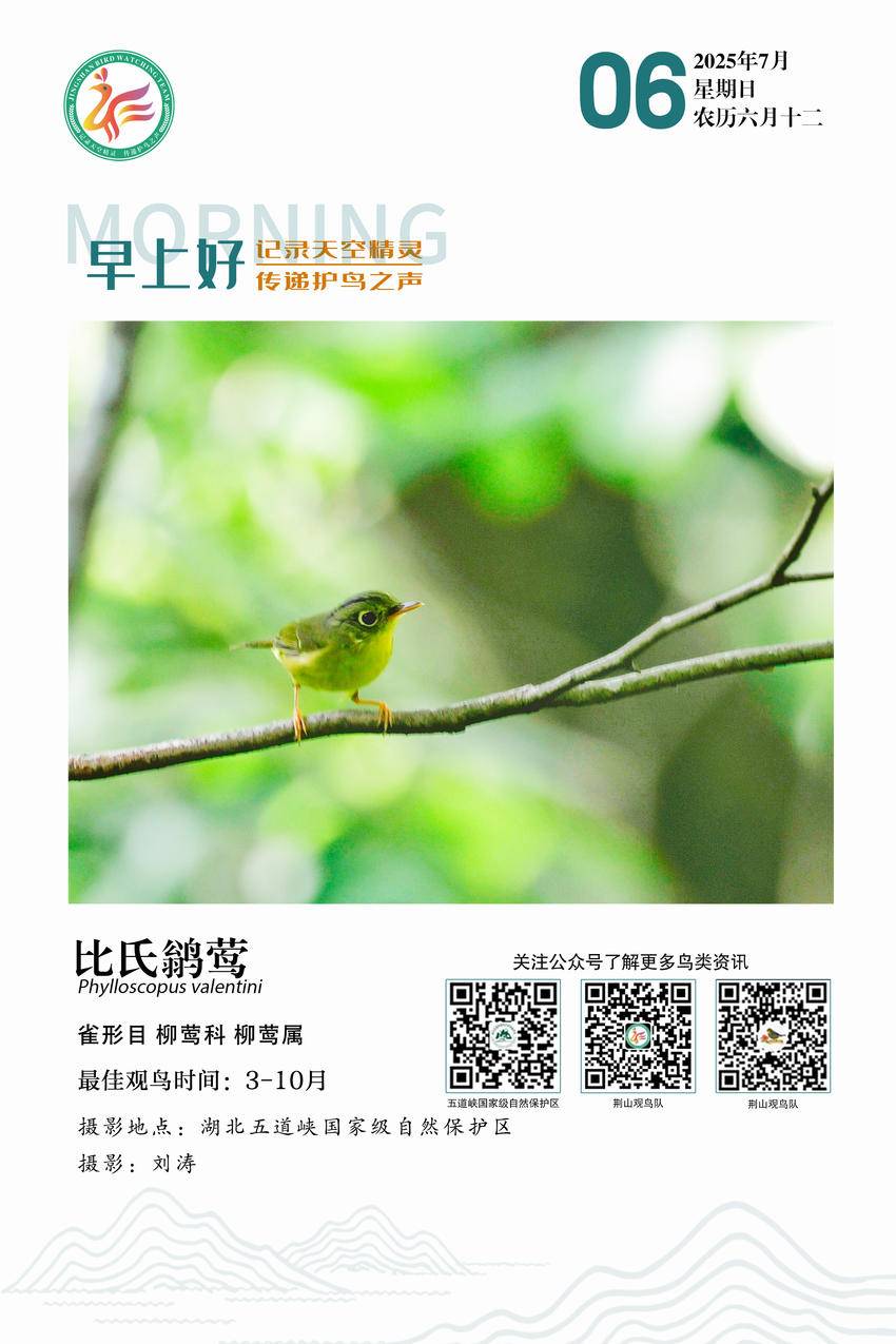 比氏鹟(wēng)莺(英文名:Bianchi's Warbler,学名:Phylloscopus valentini),是雀形目柳莺科柳莺属的鸟类。曾作为金眶鹟莺的一个亚种,现已提升为独立物种。该鸟上体黄绿色,下体亮黄色,具有不明显的翅斑和黄色眼圈。头顶有两道黑色侧顶纹,顶纹呈灰色,较白眶鹟莺和淡尾鹟莺的深灰色顶纹更浅。分布于中国中部、东南部以及越南北部的温带森林和亚热带湿润山地森林。(来源:湖北五道峡国家级自然保护区管理局)