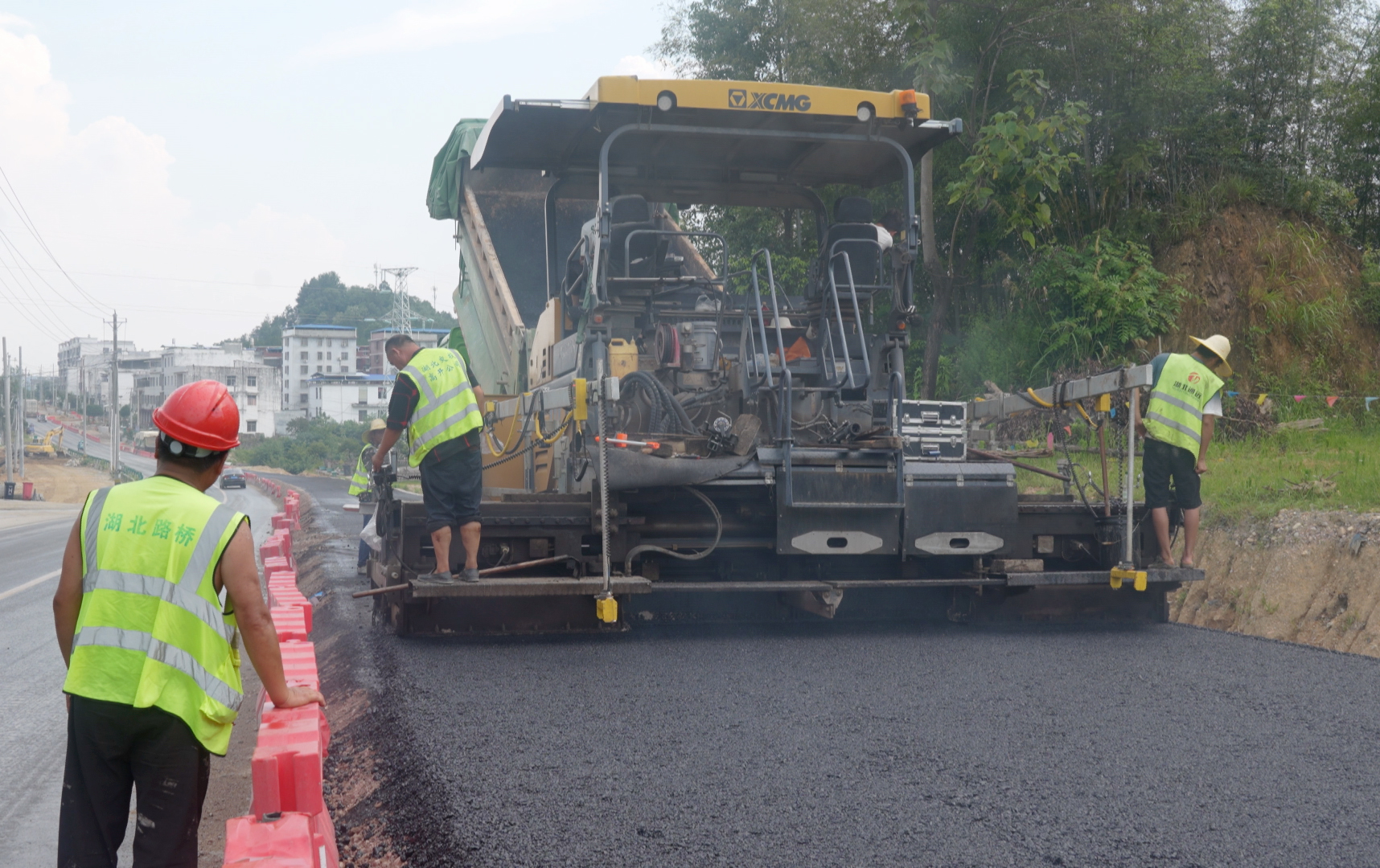 7月7日下午,骄阳似火。在106国道改扩建工程五星桥至铁柱港段施工现场,热浪裹挟着沥青蒸汽扑面而来,大型摊铺机缓缓前行,压路机紧随其后来回压实,施工人员冒着高温,正紧张有序地进行着该路段1.5公里左幅路面的沥青摊铺作业。