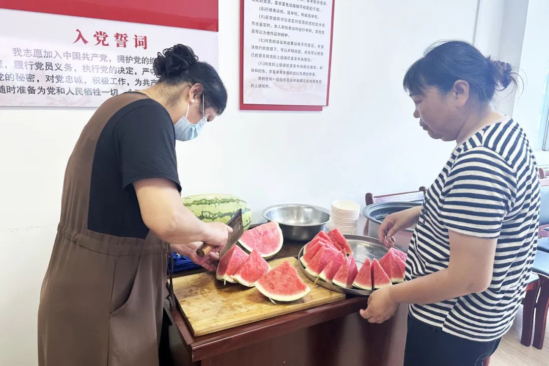 “来,尝尝刚切好的西瓜!”社区工作人员和志愿者们早早备好西瓜、绿豆汤等消暑食品。接过递来的消暑食品,户外劳动者叶元枝笑得眼角弯弯:“感觉这里像家一样,很温馨。”