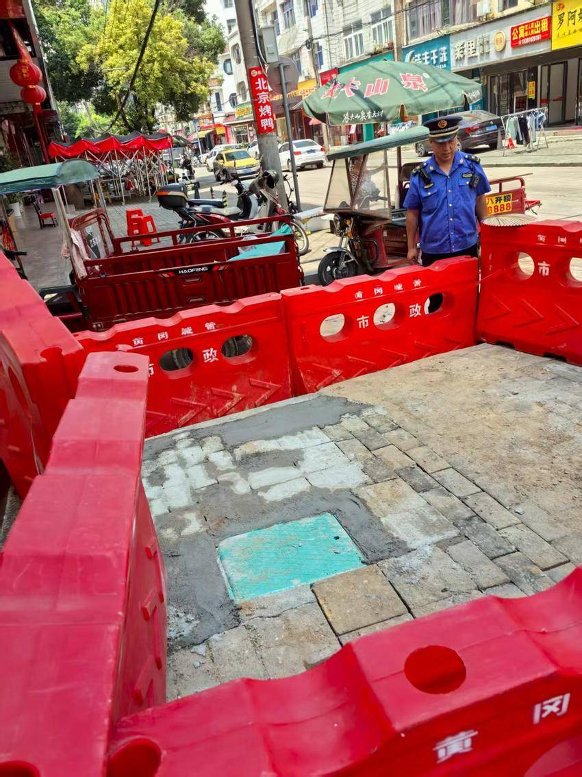 事件源于7月8日下午的一次日常巡查。赤壁大队商城片区城管执法队员在子瞻路中段巡查时,一处水表维修作业现场引起了他们的注意——维修区域周边路面破损严重,下方竟塌陷出巨大空洞,碎石和泥土散落其间。“起初只是想提醒施工方规范作业,走近后才发现情况不简单。”执法队员熊武回忆,破损路面下的大洞土壤松动,脚踩上去有明显下沉感。凭借职业敏感,队员们判断这并非普通路面破损,而是存在严重塌陷风险。