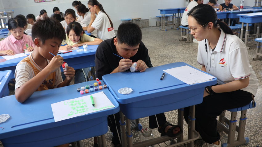 当天,湖北第二师范学院红船行志愿服务队正在对托管班的学生进行美育教育,支教老师带领学生一起绘制石膏娃娃,尊重学生的自主性,倾听他们的创意思想,引导学生涂色绘画。