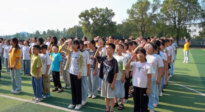 清晨校园,肃穆庄严。烈日下孩子们身姿挺拔,列队整齐,稚嫩的脸庞上写满庄重与期待。主持人卢雪琪清晰有力的声音划破宁静,叩击着每个人的心灵。目光所聚,是那抹即将升起的鲜红,是对祖国最深沉的挚爱与自豪。八时整,护旗方队步伐铿锵有力,护卫着国旗庄严前行。激昂的《义勇军进行曲》响彻云霄,五星红旗迎着朝阳冉冉升起,在晨光中熠熠生辉。全体肃立,队礼标准,深情注目。这一刻,历史的厚重与未来的希望在浠水晨光中交织,信仰的传承在无声的凝视中升华。