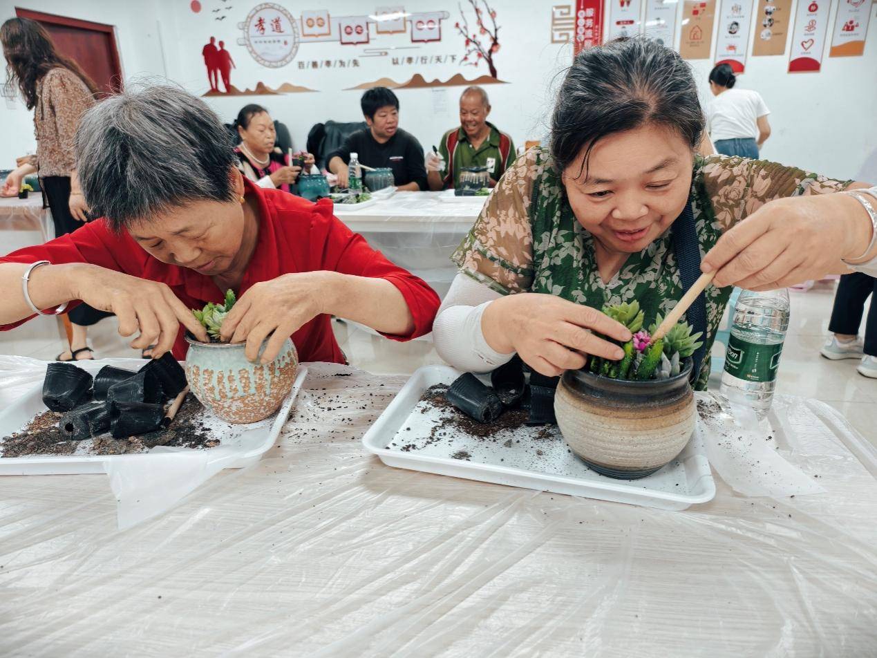 助残活动现场,在专业音乐疗愈师的带领下,参与者通过拍击节奏互动交流,放松身心。多肉种植环节,大家动手挑选叶片、填土栽培,感受种植乐趣与生命活力。