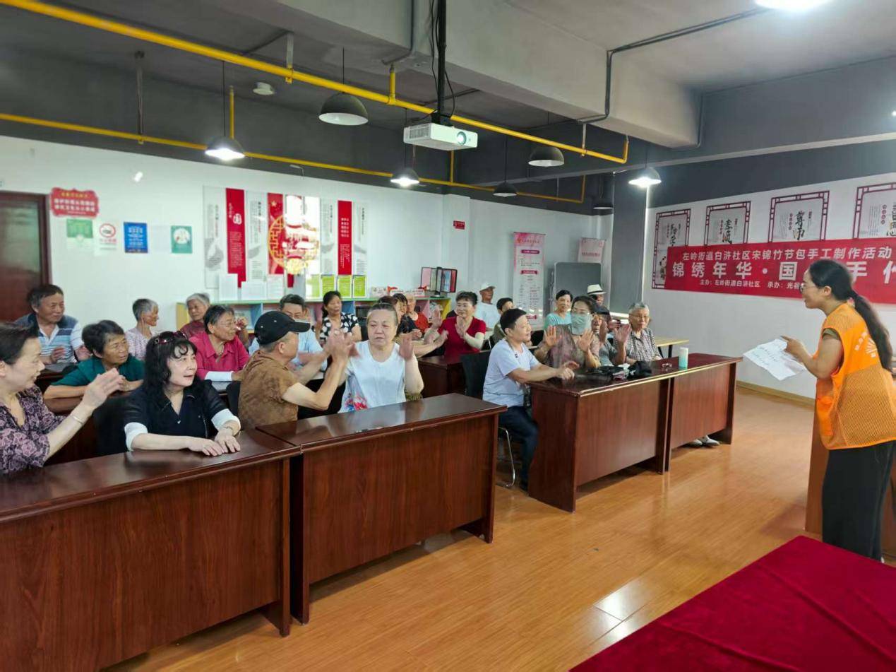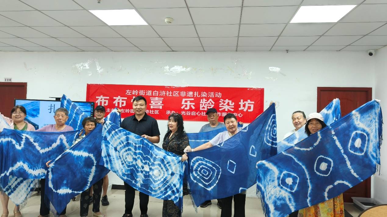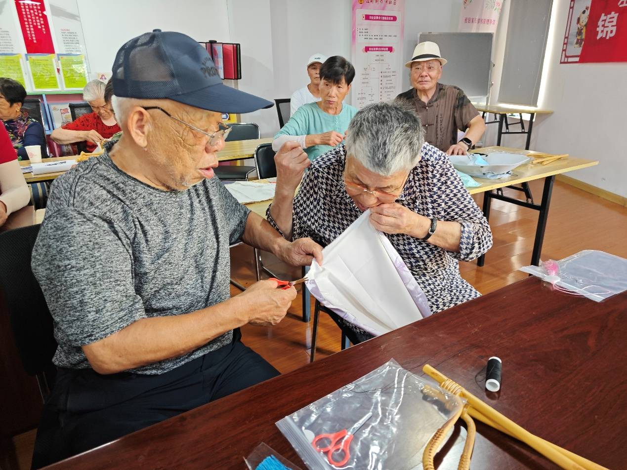 社区特向老年人推出“宋锦竹节包制作”和“扎染围巾体验”非遗手工活动,参与者用针线缝制出实用又雅致的竹节包,用传统技法将素色围巾染出独一无二的图案。