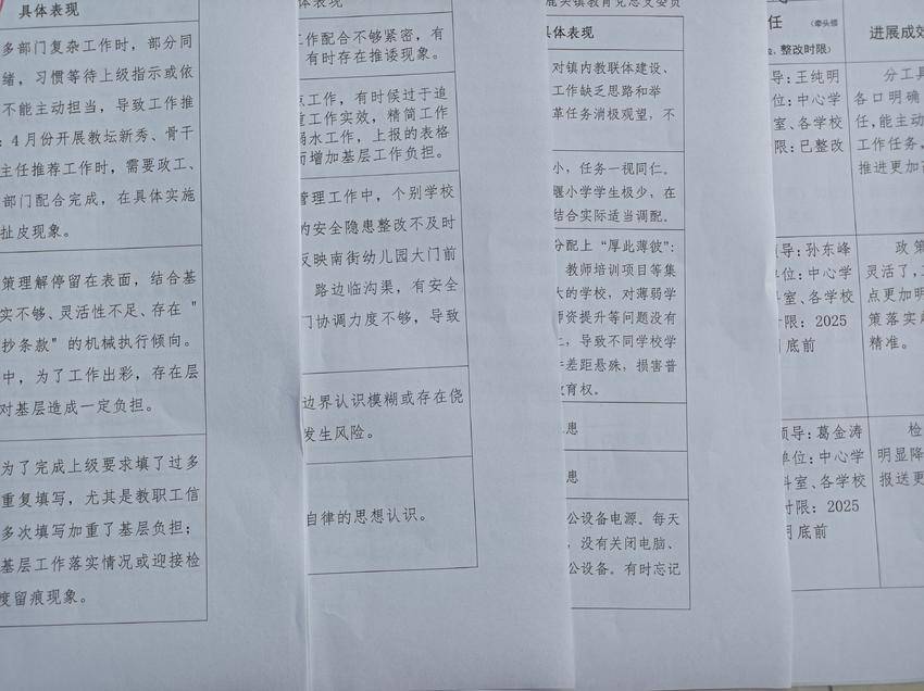 查摆整改提质效。在学习教育活动中,全镇教育系统聚焦民生关切与发展堵点,教育党总支班子成员带头查摆漠视群众侵害群众利益、违规收送礼品礼金等问题27条,教育党总支层面累计查摆问题11条,做到见事见人、靶向精准。针对查摆出的问题,班子成员主动认领、牵头整治,逐项制定整改措施,明确时限与责任。通过全面“回头看”,确保整改落实“件件有回音、事事有着落”。真改实改不走过场,推动教育生态持续净化。