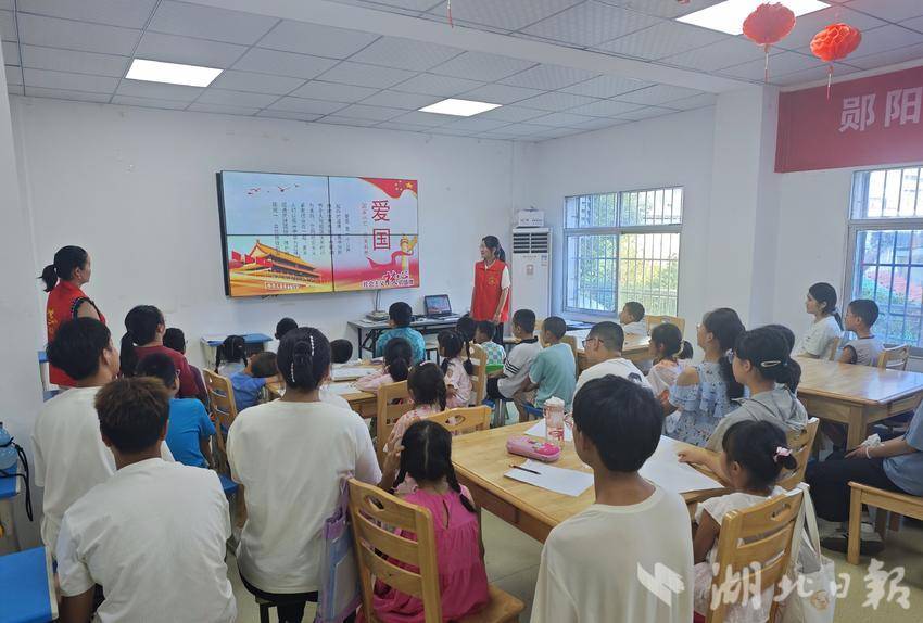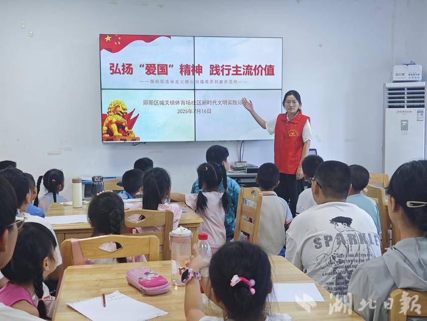 湖北日报客户端讯(通讯员况静文、孟浩、朱肖亮、徐舒琴)7月16日,郧阳区城关镇体育场社区新时代文明实践站组织志愿者走进暑期托管班,开展“弘扬爱国精神 践行主流价值”主题活动,让孩子们在轻松氛围中感悟爱国精神。