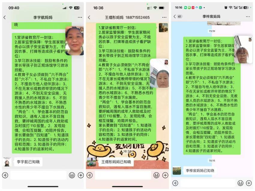 借助班级微信群、公众号等线上平台,高频次推送防溺水安全知识、警示案例等内容,时刻提醒家长和幼儿绷紧安全弦。同时,要求家长在收到信息后及时回复确认,确保宣传教育全覆盖。班主任向本班每位幼儿家长打1个防溺水警示提醒电话或发1条警示提醒短信,要求家长做到孩子外出“四知道”,教育孩子做到防溺水“六不两会”。