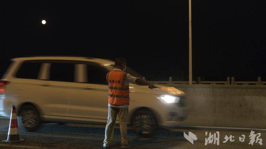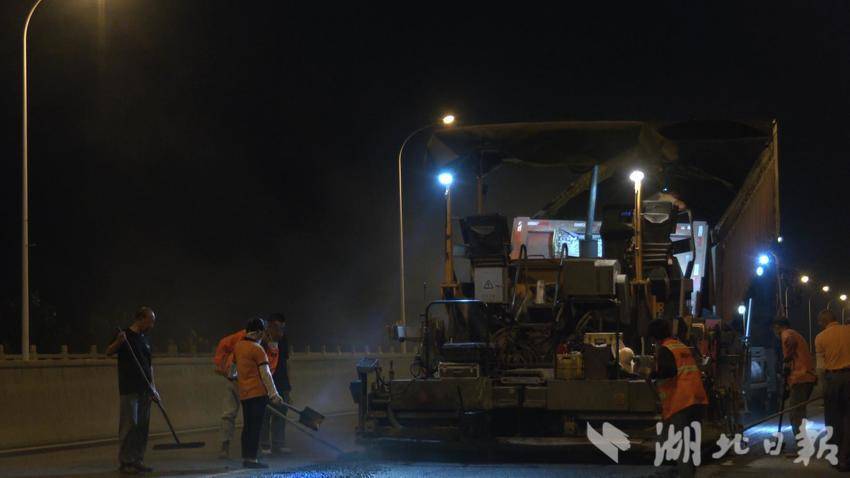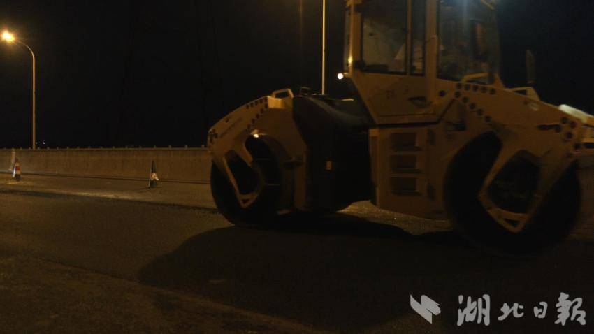 随着夜幕降临,气温稍有回落,但桥面依旧闷热。晚上 9 时左右,沥青摊铺机进场,滚烫的沥青被源源不断地输送到摊铺机中,站在几米外都能感受到扑面而来的高温。摊铺机缓缓前行,将沥青均匀地摊铺在桥面上,紧随其后的压路机一遍又一遍地在新铺的沥青路面上碾压,轮胎与沥青接触时发出 “滋滋” 的声响,将路面压得平整坚实。尽管已是深夜,但高温仍未退散,工人们的脸上挂满汗珠,在路灯照射下闪闪发亮。