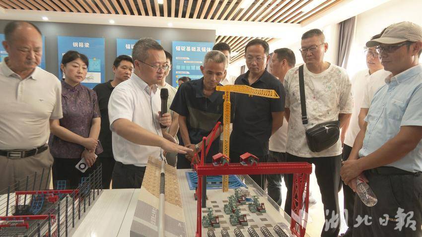 在中交二航局双柳长江大桥项目部,一行人首先通过数字化施工沙盘,直观了解项目整体布局以及建设进度。项目负责人以“科技赋能生态桥梁”为主线,系统阐释了这座长江大桥建设中的技术创新与环保实践。在施工模型前,负责人详细拆解了桥梁主塔、钢箱梁、锚碇基础等各个部分的技术突破与创新运用,展现了百年桥梁的匠心工艺。项目使用“智能静音施工系统”,施工中严控噪音扬尘,采用单跨钢箱梁结构替代江中打桩,避免施工对长江江豚栖息地的干扰,只为守护“江豚的微笑”。参观过程中,人才代表就智能建造技术应用、生态保护等议题与项目团队展开深入交流。