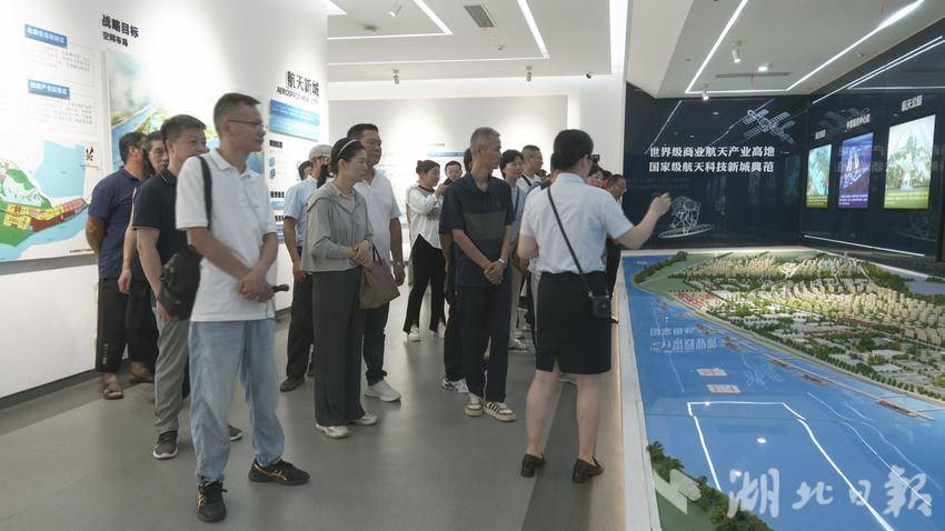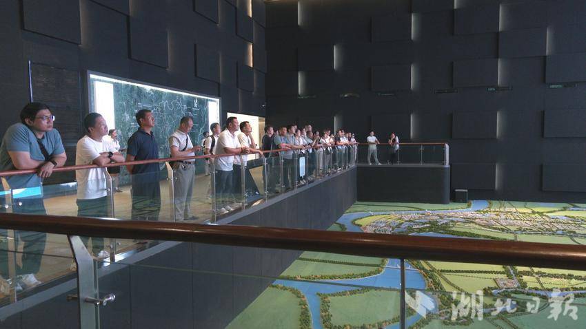 作为问津产业新城的核心地标,新洲城市规划馆以“水韵磐石”为设计理念,深色仿石材外立面呼应问津书院“墨池砚石”的千年文脉,内部通过数字化沙盘、全息影像等科技手段,构建起历史与未来的对话空间。在工作人员的讲解下,问津人才们详细了解了新洲区域发展历程与未来规划,在数字化智能影像下,12个街镇的发展蓝图在眼前徐徐展开。结合展厅内智能制造产业链图谱,工作人员重点讲解了以航天科工、武船集团为龙头的智能制造产业,以华中区域粮食应急保障中心为代表的现代物流业,航天基地配套设施建设情况以及正在崛起的乡村示范带。