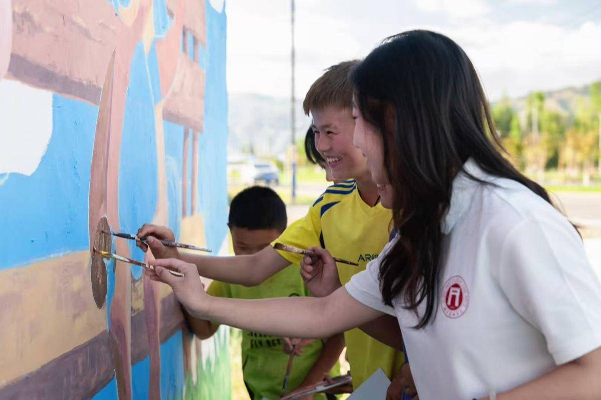 整整一周,团队顶着40度的高温与灼人的烈日,用心用情地完成了墙绘与地绘创作:边防站旁的墙面上添上了鲜艳的五星红旗和军人威武的身姿,村口墙面上两只卡通小马拉着马头琴,仿佛在拉着悠扬的乐曲。